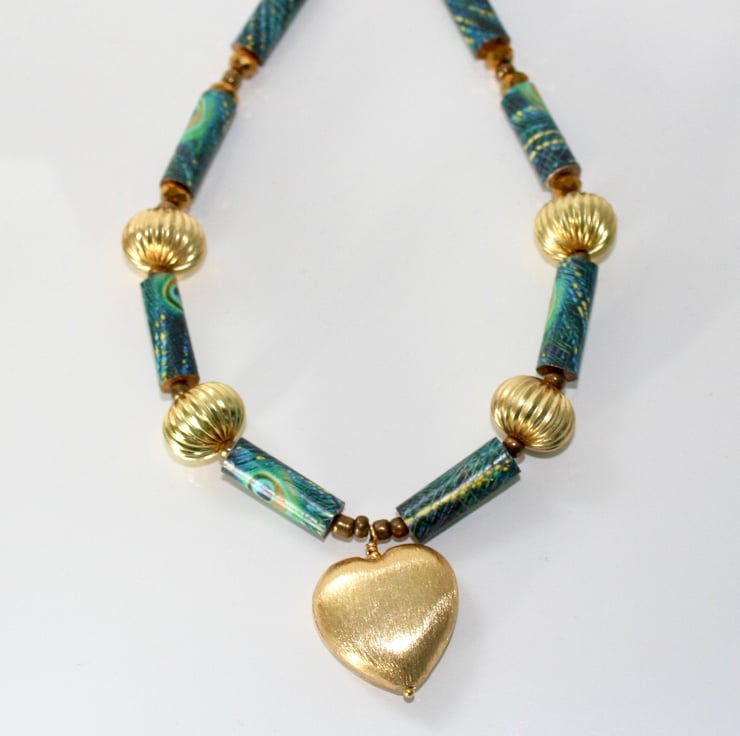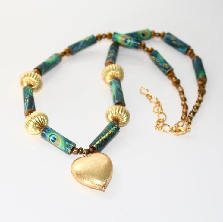 This striking necklace is made with beads I have handmade with peacock printed paper and sealed with varnish. Also featured is a brushed gold plated heart, fluted gold plated metal beads, faceted gold glass rondelles and gold coloured seed beads. It is finished with a gold plated lobster claw clasp.