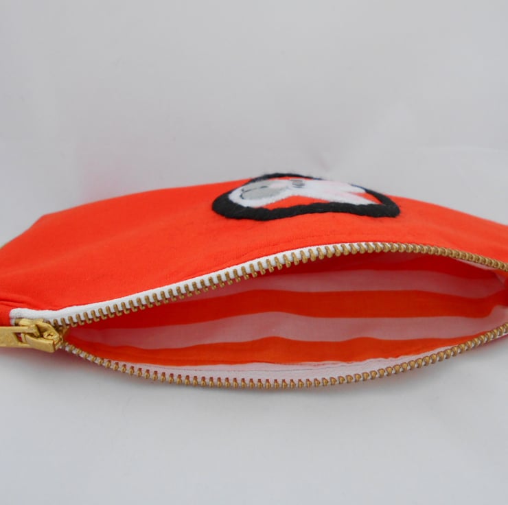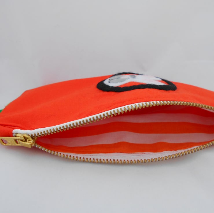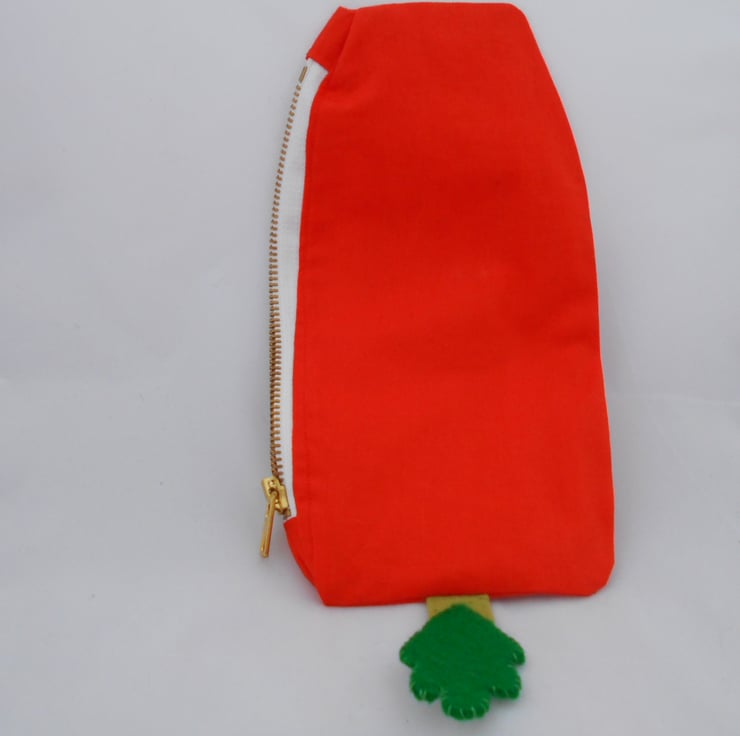 A quirky Rocket Pencil Case in the shape of a Carrot. Applique Rabbit is sewn on and is awaiting his mission into space!!