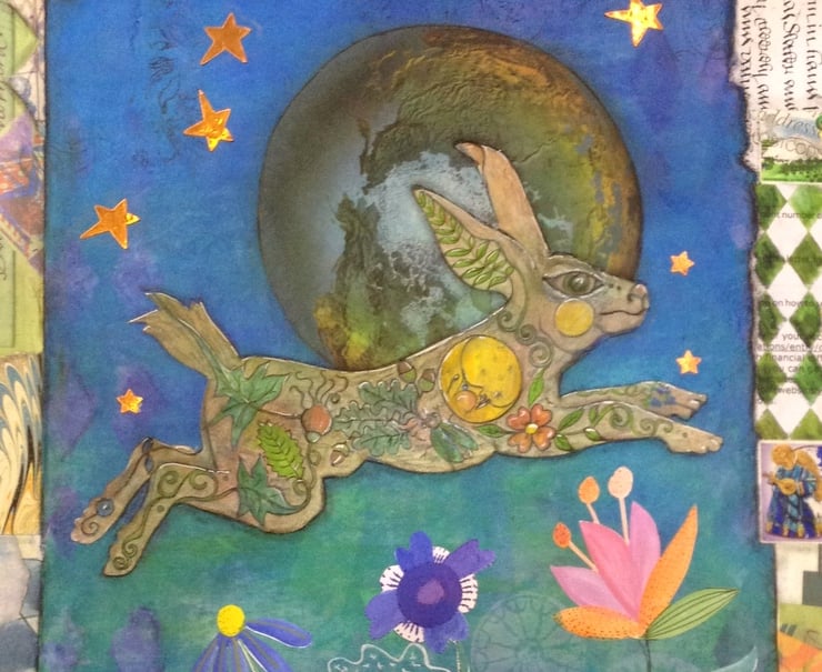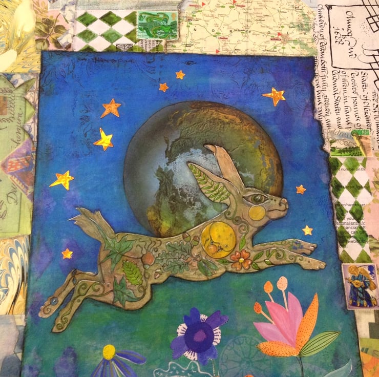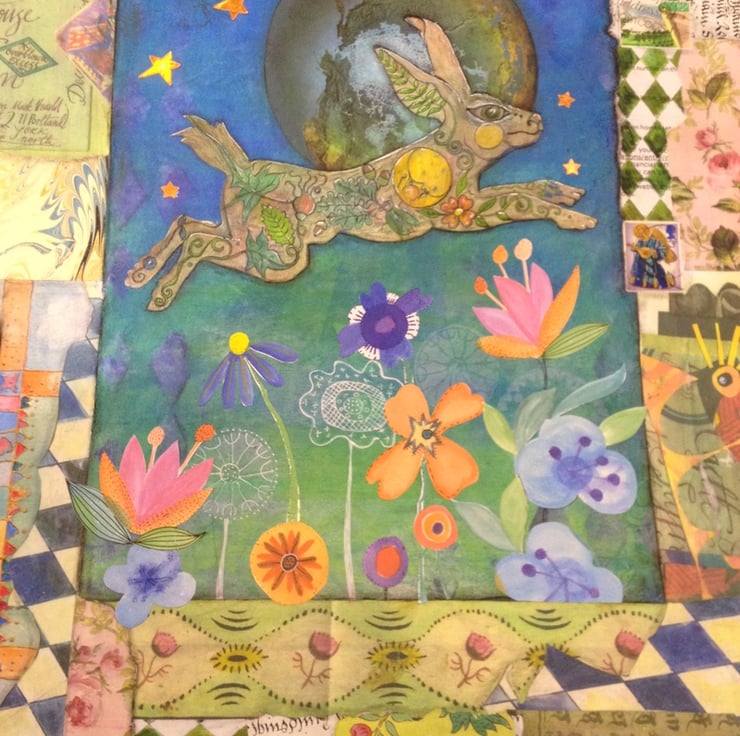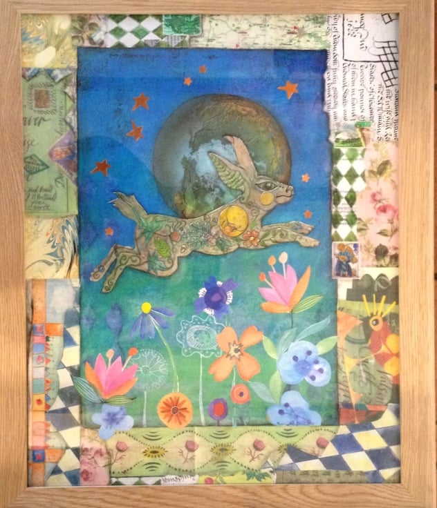 A Hare of the world is an original multimedia artwork. The work measures 20 x 16 inches and is framed in solid Oak, overall measurements are: 22 x 8 inches.