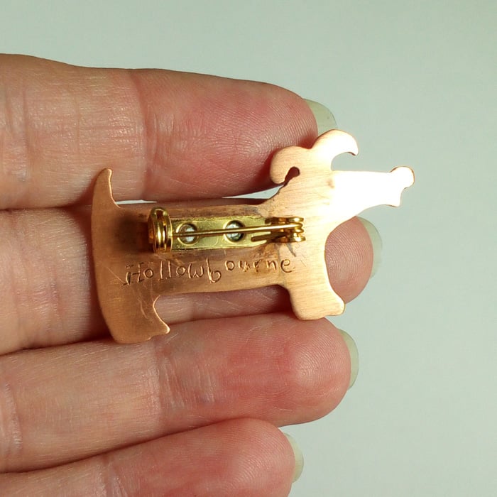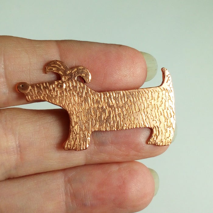Small sausage dog, pink copper brooch.