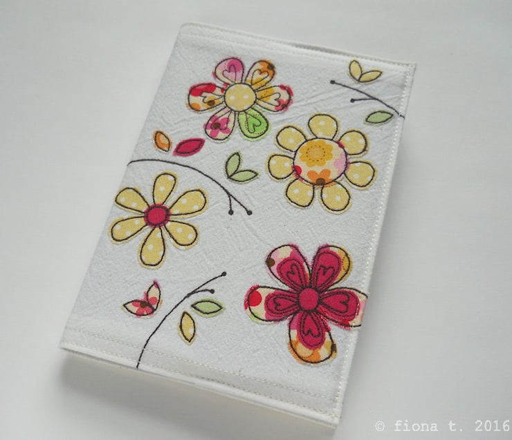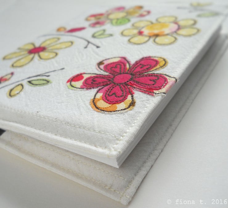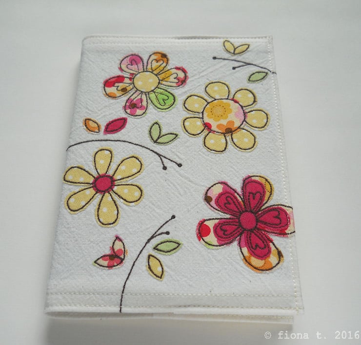 embroidered fabric notebook cover with stylised florals in print and plain cotton fabrics.