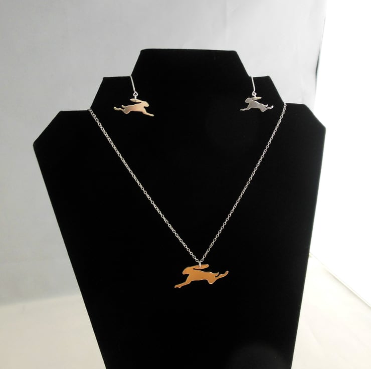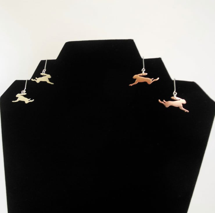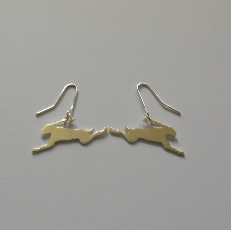 The hares are cut by hand from sheet Sterling silver with a piercing saw , all of the connections and the ear wires are Sterling silver.