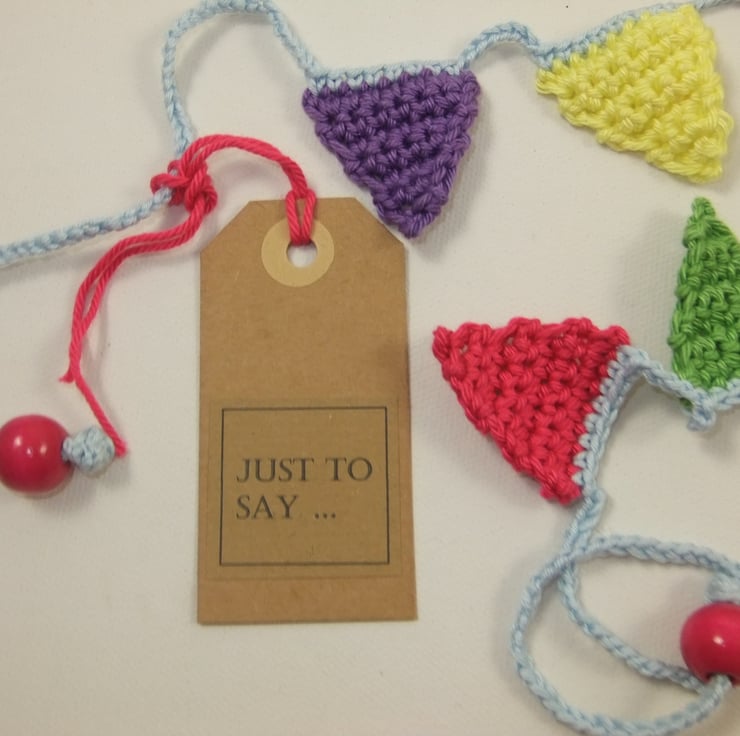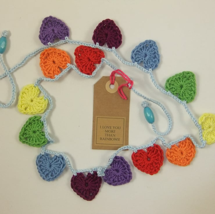 A delightful crocheted garland of hearts in rainbow colours with a tag at one end, so that you can send a message with this pretty keepsake! The tag reads: ‘I love you more than rainbows’ though I am willing to replace this with one bearing your own message – please email me your requirements when buying. The garland is crocheted in 100% cotton and measures approximately 108 cm long. The ends of the pale blue string are finished off with wooden beads for easy tying. The 14 hearts each measure approximately 3 cm in diameter. The garland comes wrapped in tissue in a labelled PIP (Posting in Proportion) box all ready to be sent or given in style.