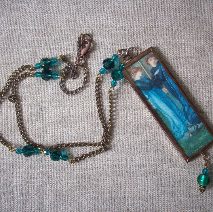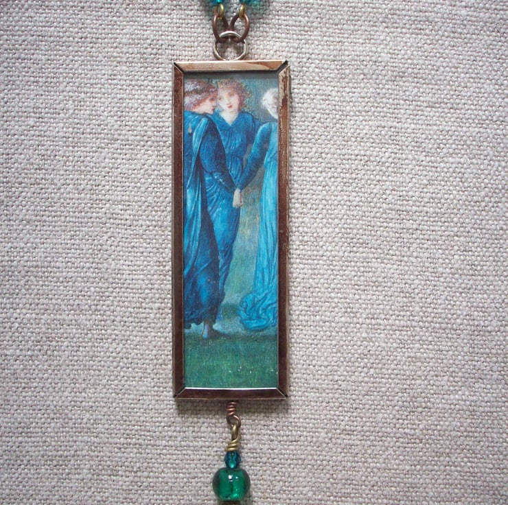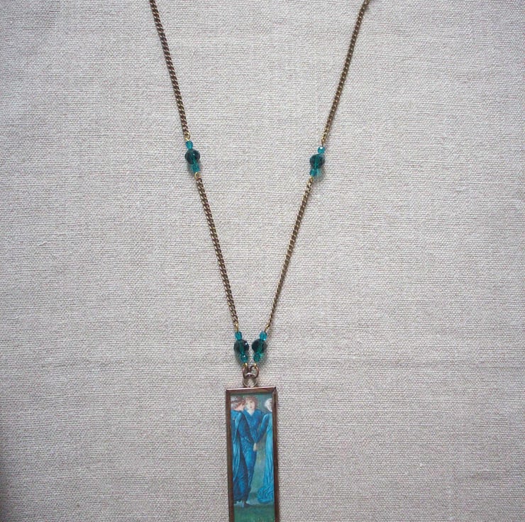 Found image under glass of an elegant work in rich teals and Aesthetic peacock blues of a typically dream-like lyrical work by Burne Jones. The pendant is set on a beaded chain of faceted beads to match. There is a slight gap in the closure of the frame which happens sometimes with these long frames which I have reflected in a lower price. Comes to you in an organza bag. I always use Special Delivery for the insurance cover for both buyer and seller. For non UK or multiple orders please contact me as prices vary. Thanks for looking and for supporting handmade!