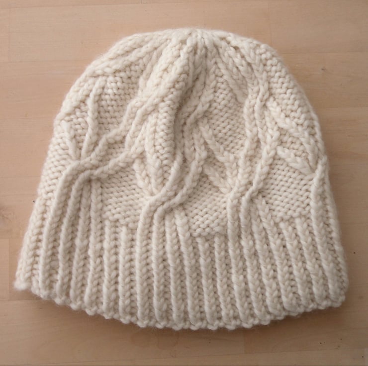 Hand knit chunky cabled beanie hat. Great for this coming winter. Will keep your head and ears super warm. Beautiful flower motif adorns the top of the hat.