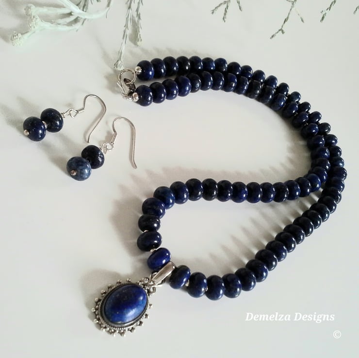 A beautiful genuine labiz lazuli necklace and earrings set made with a antique style sterling silver pendant built within its main construction.