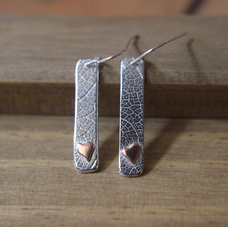 Silver earrings with printed leaf pattern with copper leaf design.