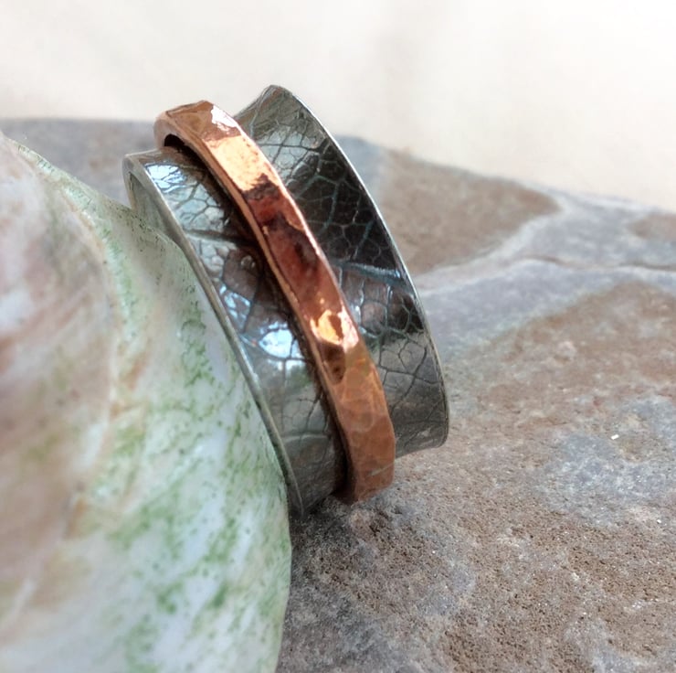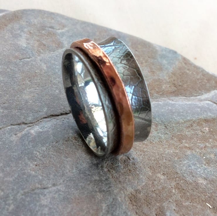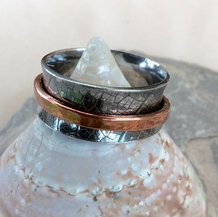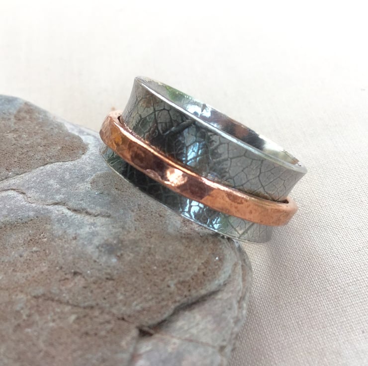 The inner ring is made of sterling silver which has been imprinted with a leaf skeleton texture then treated with oxidising agent to darken the imprint and create a vintage patina. It has been hallmarked by the London Assay Office. The spinner is made of copper, about 2mm wide, and has been textured with a ball-pein hammer. I have one of these rings in stock: UK size U, which could fit either sex.