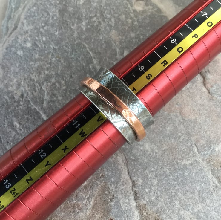 This chunky silver spinner ring is perfect for someone with fidgety fingers who always needs something to twiddle! A spinning ring is a bit like worry beads - it is said to relieve stress and help you to concentrate. The silver ring is anticlastic in shape, meaning that the surface is flared outwards at the top and bottom, allowing the copper ring to spin freely.