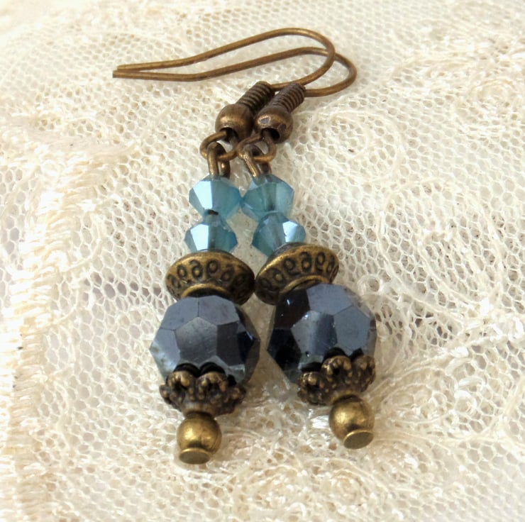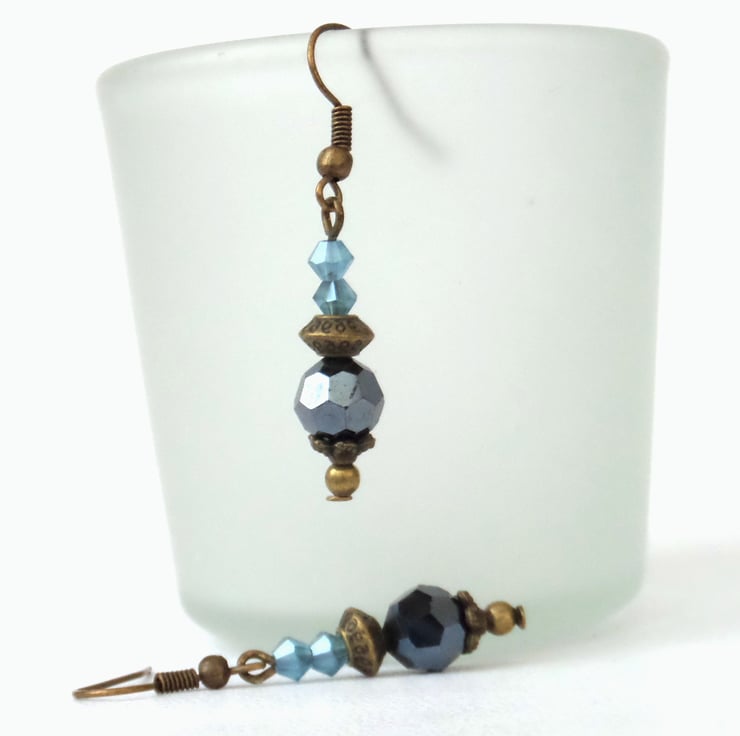 A great combination of jet and mid blue crystals hang from bronze wires in these vintage style earrings.