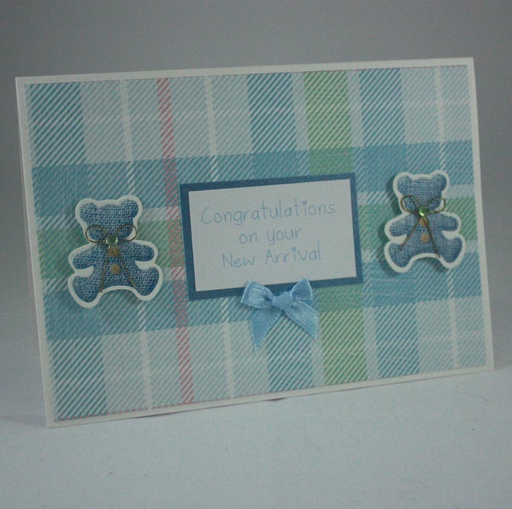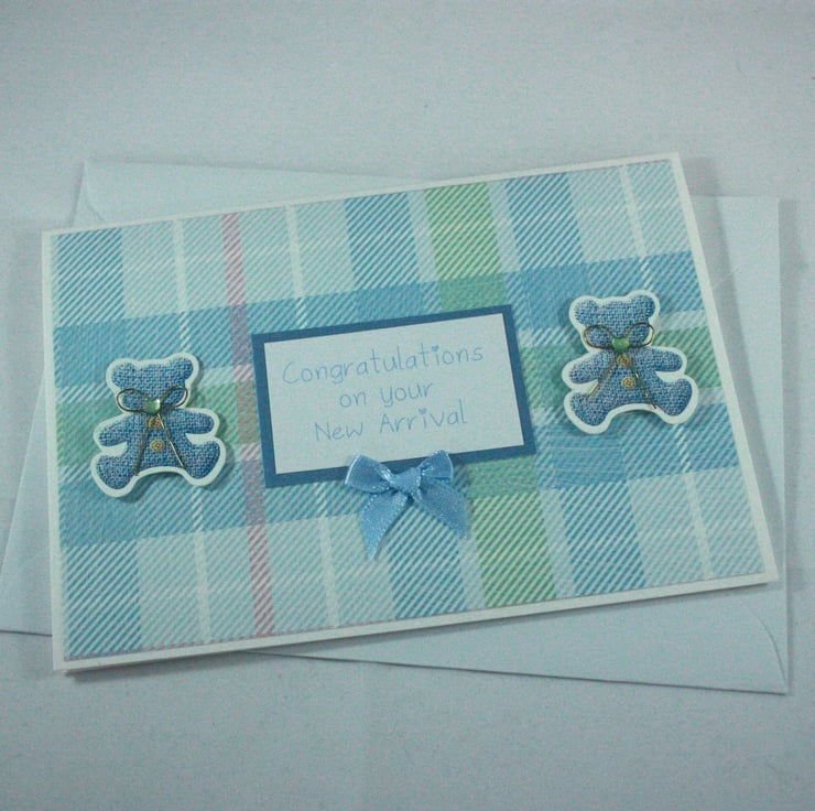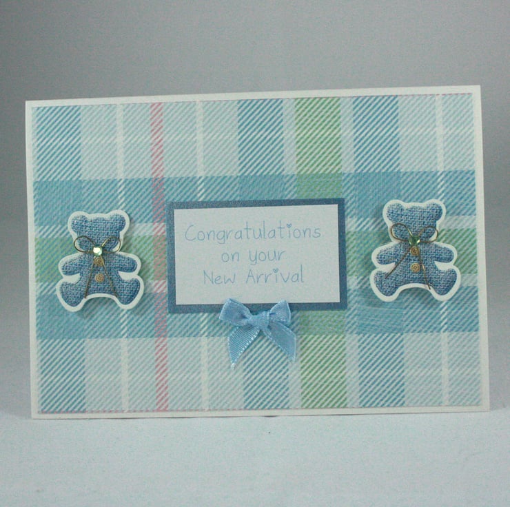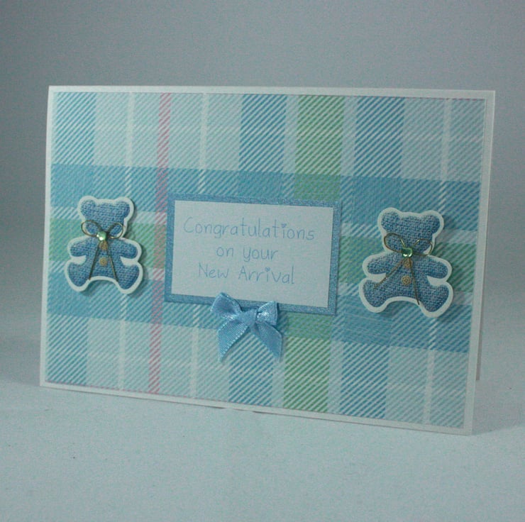 A6 sized, landscape orientated, new baby card. The card features two blue teddies and the message 'Congratulations on your New Arrival' on a background of pastel blue tartan. The card is finished with a small blue satin bow.