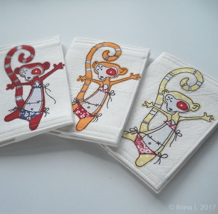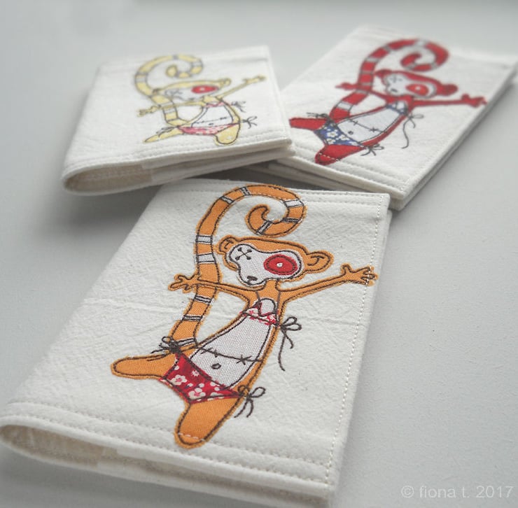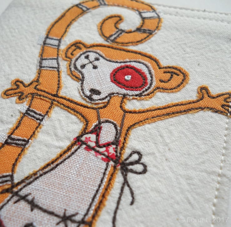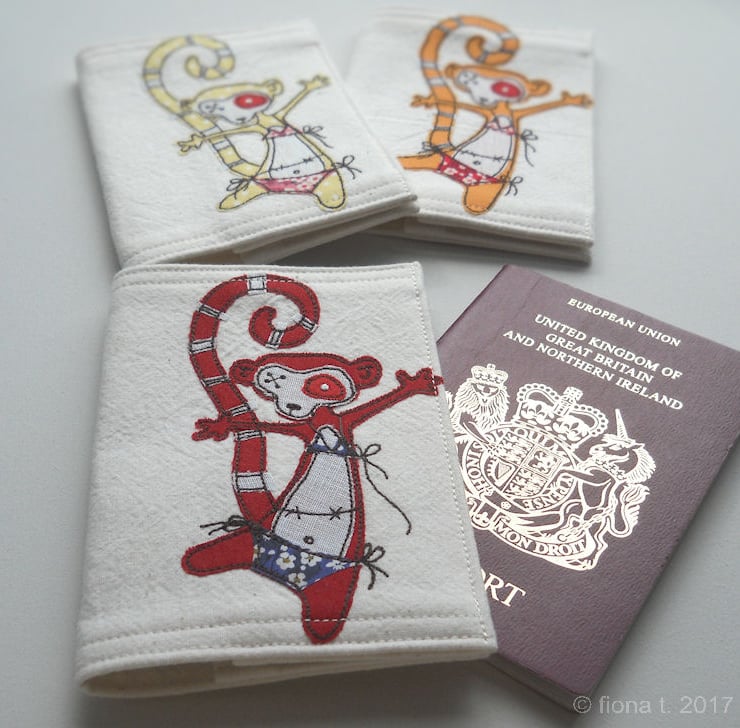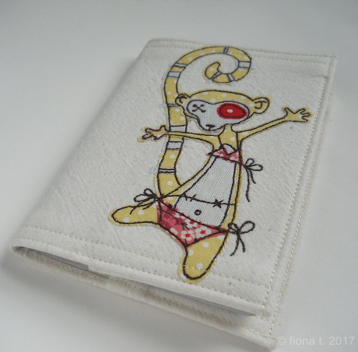 applique and freehand embroidered zombie lemur fabric passport cover.