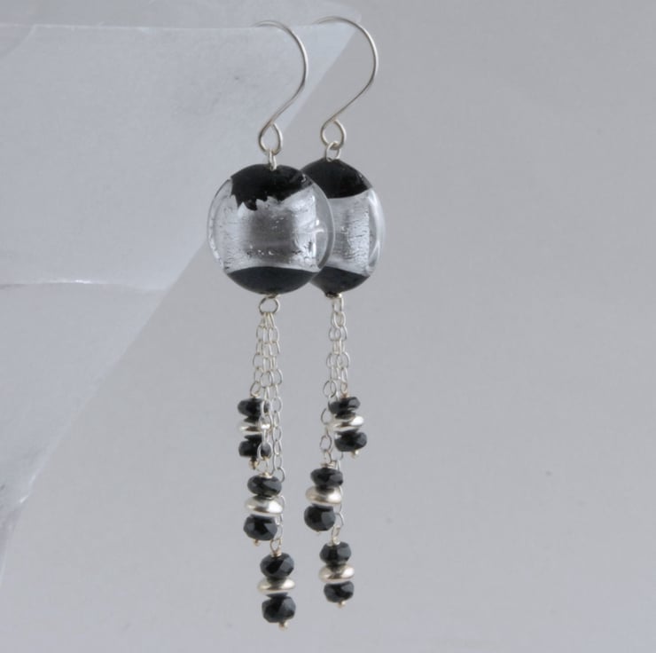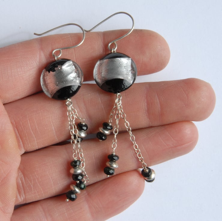 In a twist on the classic monochrome these earrings feature hand made murano glass beads in black with silver foil detailing, a colour scheme which is picked up in the dangle of beads that hangs from them. The 'tassle' is made from sterling silver chain with the strands terminating in clusters of black tourmaline and sterling silver beads which add movement and even more sparkle. They have been finished off with hand made sterling silver hooks. These long dangly earrings are perhaps better suited to being worn on nights out but why not wear them to the office as well.