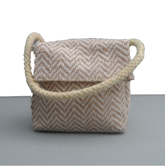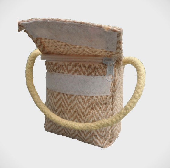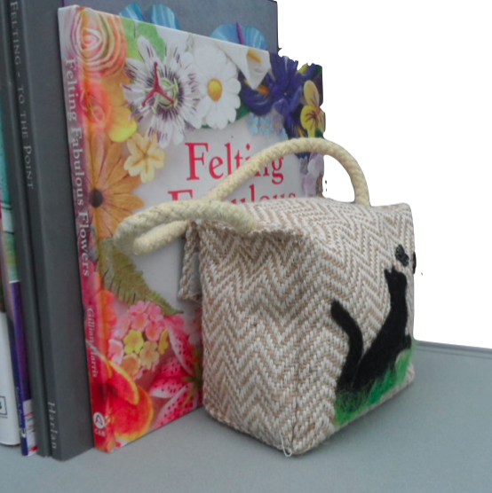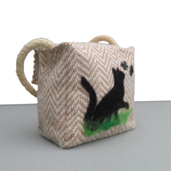A lovely little doorstop onto the front of which a black cat silhouette has been needlefelted and two small butterfly decorations have been added. It measures approximately 11cm (w) x 12cm (h) x 7cm (d) (4.25" x 4.75" x 2.75"). The doorstop weighs approximately 750g and is made from a beige coloured herringbone patterned fabric which is plasticised on the inside and is sealed with a zip and an additional velcro closure. The weight is provided by rice which has been enclosed further in a plastic ziplock bag to prevent spillage. A rope handle is attached to the top.
