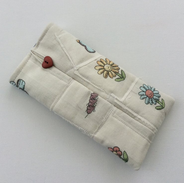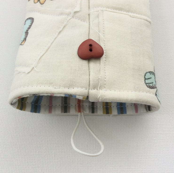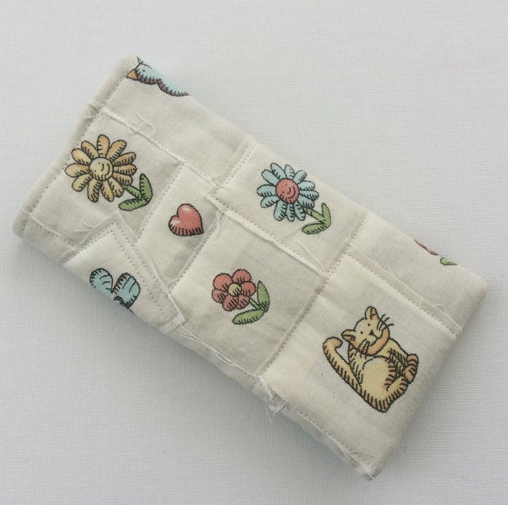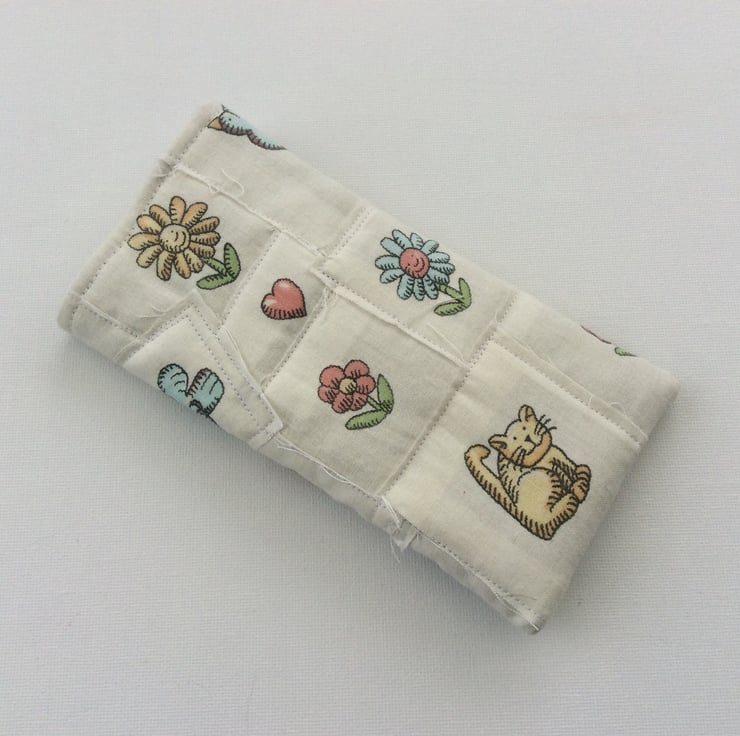 This glasses case is a one off and would be exclusive to you! The case is made from a panel of lightly padded quilted patchwork. The patchwork is constructed from fabric pieces left with raw edges and therefore some shedding of threads is inevitable adding to the shabby chic-ness of it all. The case measures approximately 17cm x 9 cm and there is an elastic loop and button closure.