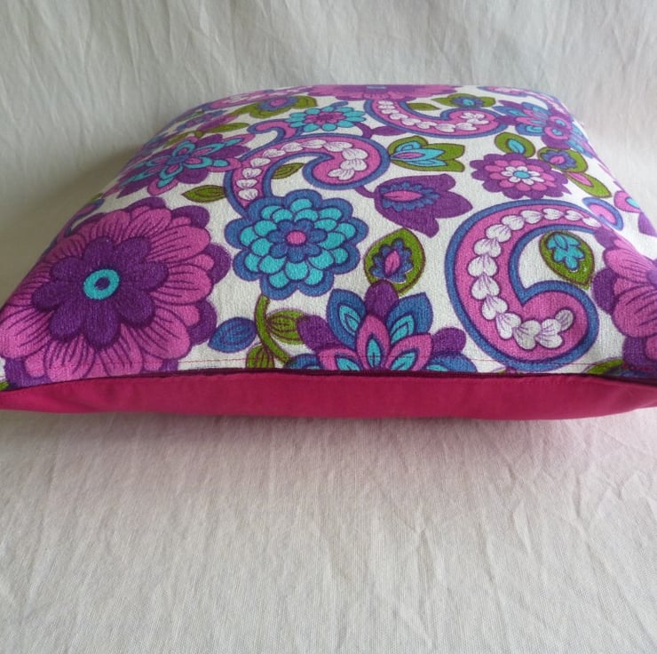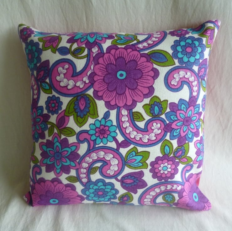 These cushion covers are made from a piece of unused vintage cotton barkcloth fabric. The fabric is in mint condition and features a vibrant stylised design of flowers which is typical of the 1970s.