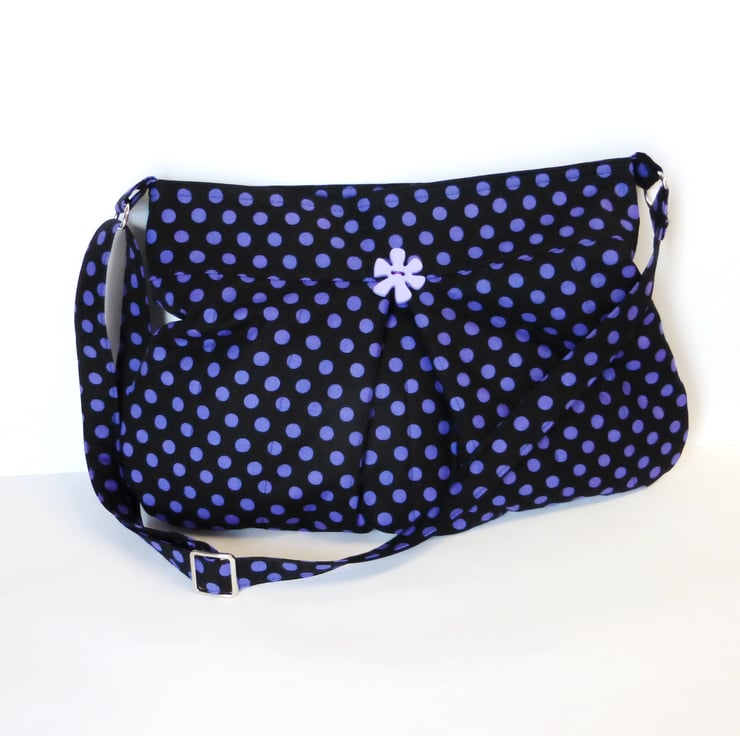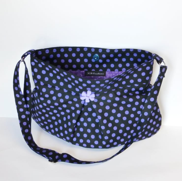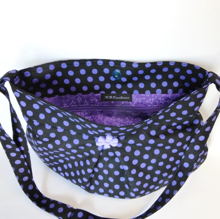 Beautiful lightweight shoulder bag made from 100% cotton. The main fabric is in a purple spot on a black background. The bag is lined in cotton fabric in a purple floral effect design.