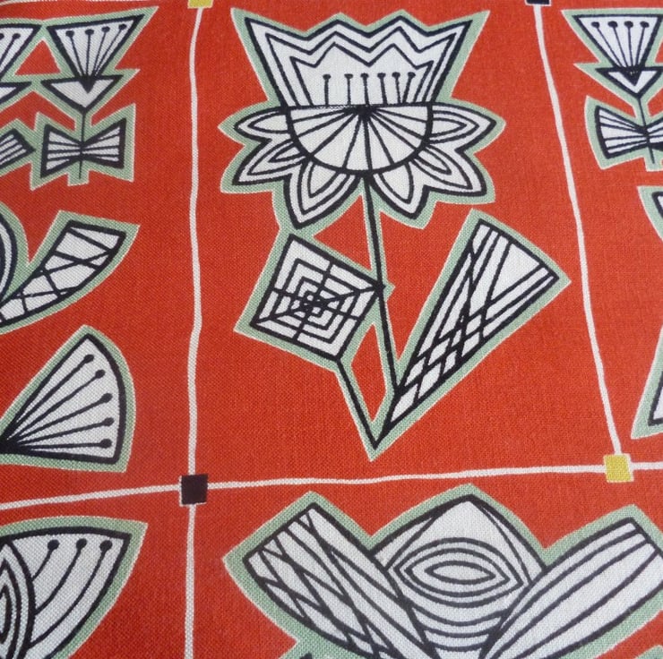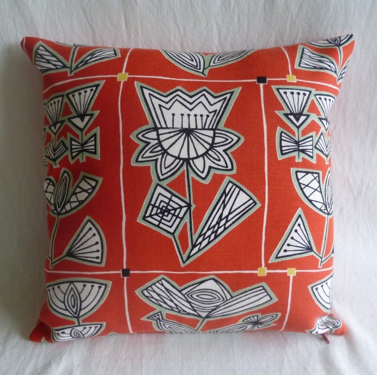 This cushion cover is made from a piece of unused vintage rayon fabric manufactured by David Whitehead in the 1950s. The stylised pattern of individual flowers within rectangular frames was designed by Hilda Durkin and reminds me of Aztec designs. The smooth textured fabric is tomato red in colour and is in mint condition.