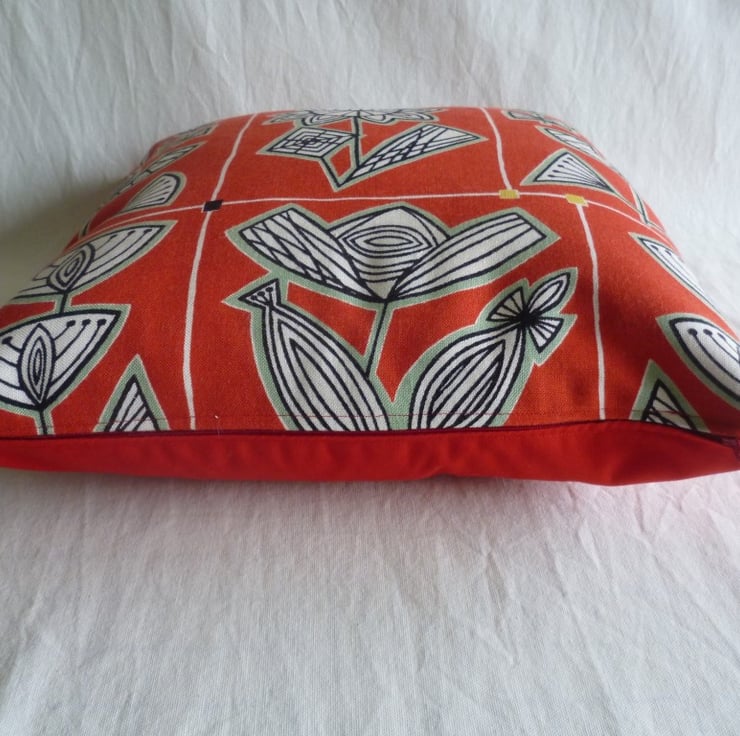 The back of the cushion cover is made from plain red cotton twill and the cover fastens with a zip at the bottom. The cover is made to a high standard and all internal seams are overlocked for strength.