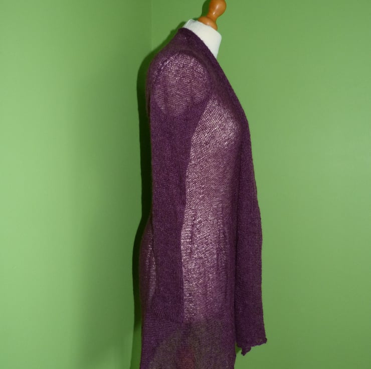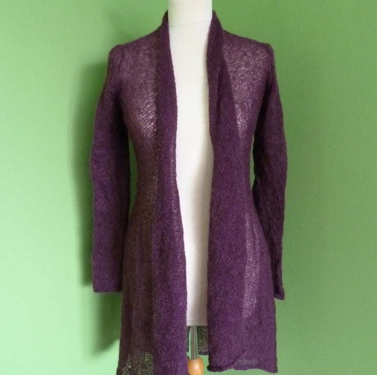 This cardigan is designed to be worn with plenty of swirls and drape and looks fabulous over jeans. It can be worn open, but looks equally good with a large brooch or belt.