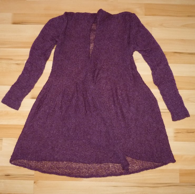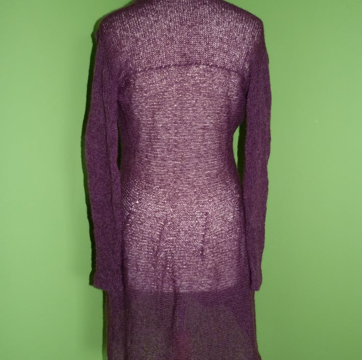 I have created this wonderful light weight mohair top on a flat bed knitting machine. It is knit in an open circle design and attached to an upper back panel. There are lots of darts knitted into the waist to give the top flare and drape. The sleeves have a closed hem cuff are close fitting, but with plenty of stretch. The edges of the top gently roll.