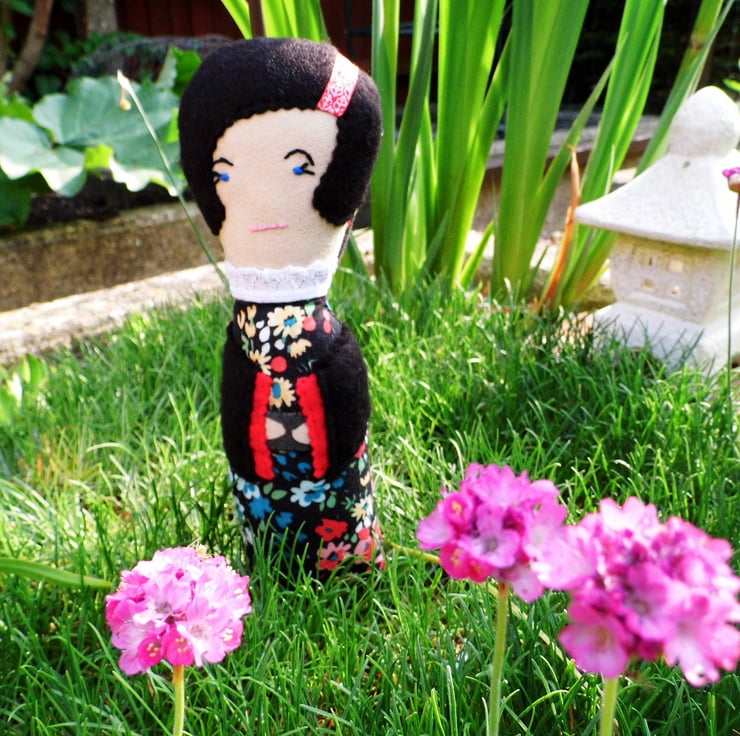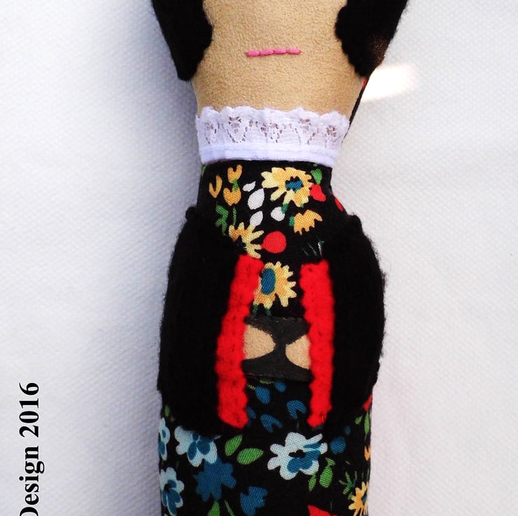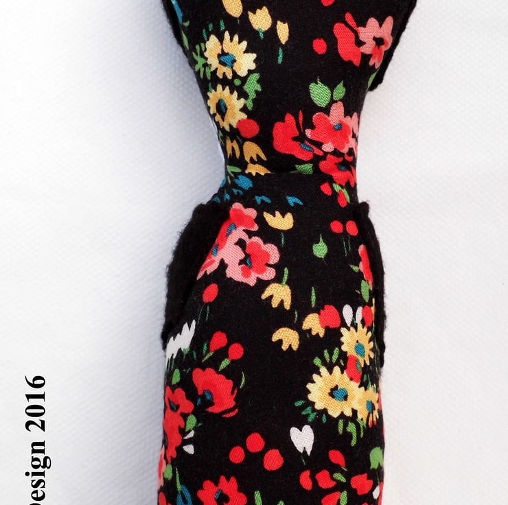 She has a cotton floral dress with a pretty nylon lace collar and her sleeves are made from red & black felt.