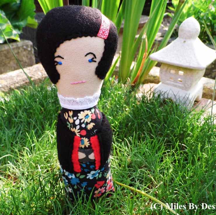 Her face is made from beige suede look fabric, she has black felt hair with a red & white patterned ribbon embellishment. Her eyes and mouth are hand sewn with embroidery thread.