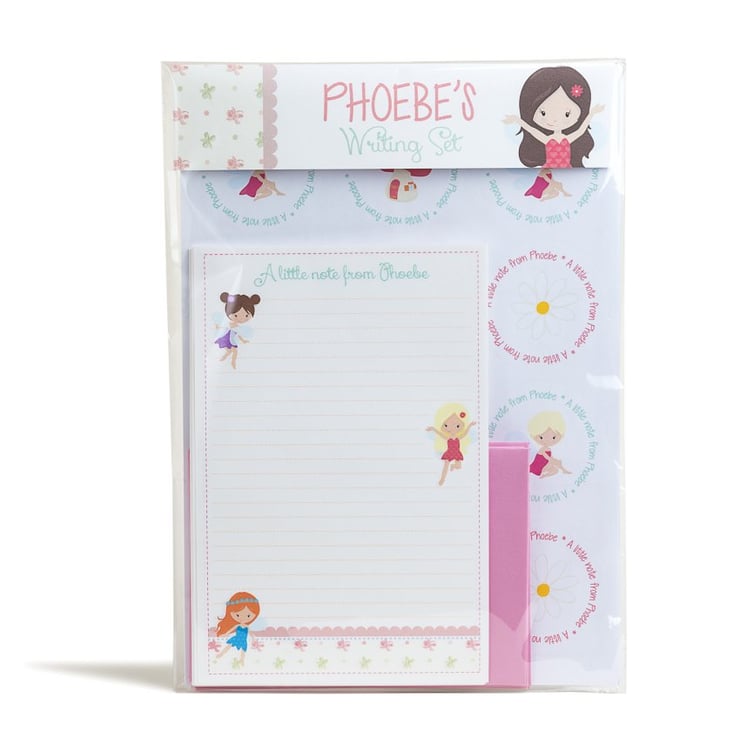 Each set includes 12 sheets of personalised writing paper with coloured envelopes plus a sheet of matching envelope seal stickers and decorative address labels.