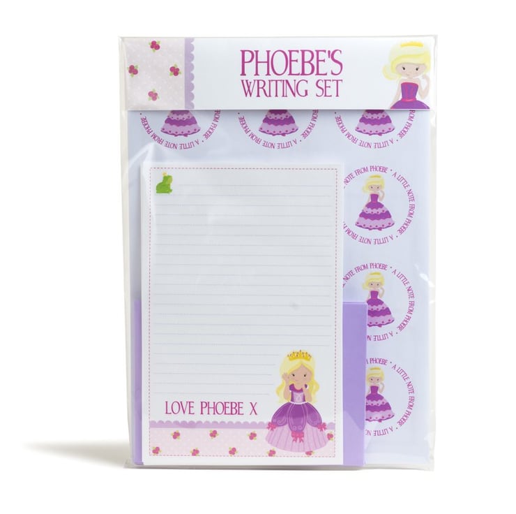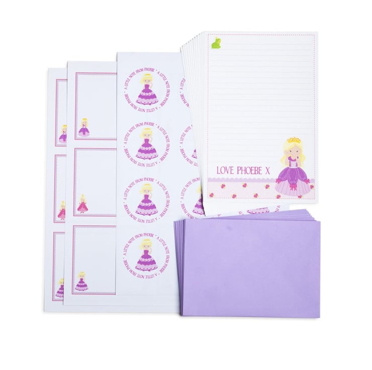 Each set includes 12 sheets of personalised writing paper with coloured envelopes plus a sheet of matching envelope seal stickers and decorative address labels.