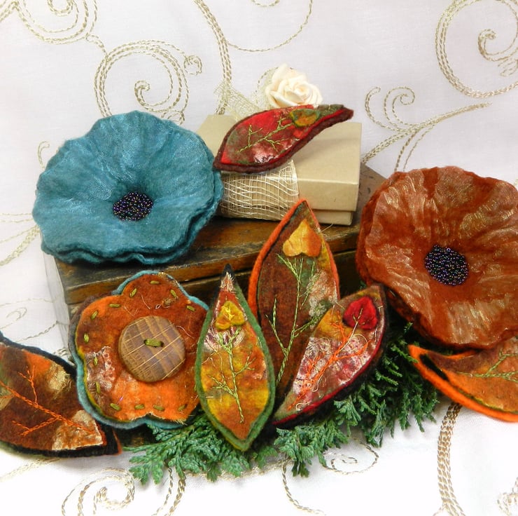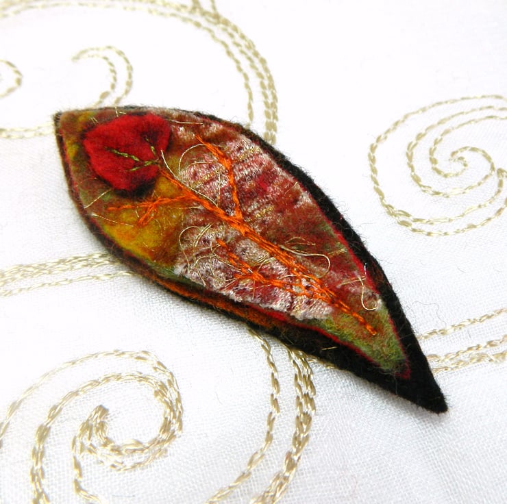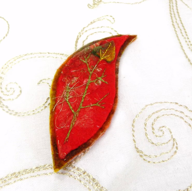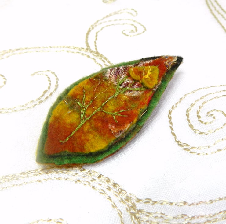 Leaf brooches are made using a mixture of the traditional wet felting process and a little modern needle felting along the way. I add fabrics and threads as it is formed. The piece is then rinsed, dried, cut and embroidered and a fastening securely added to the back.