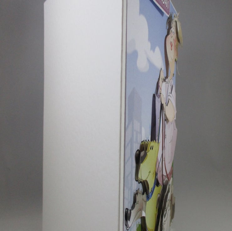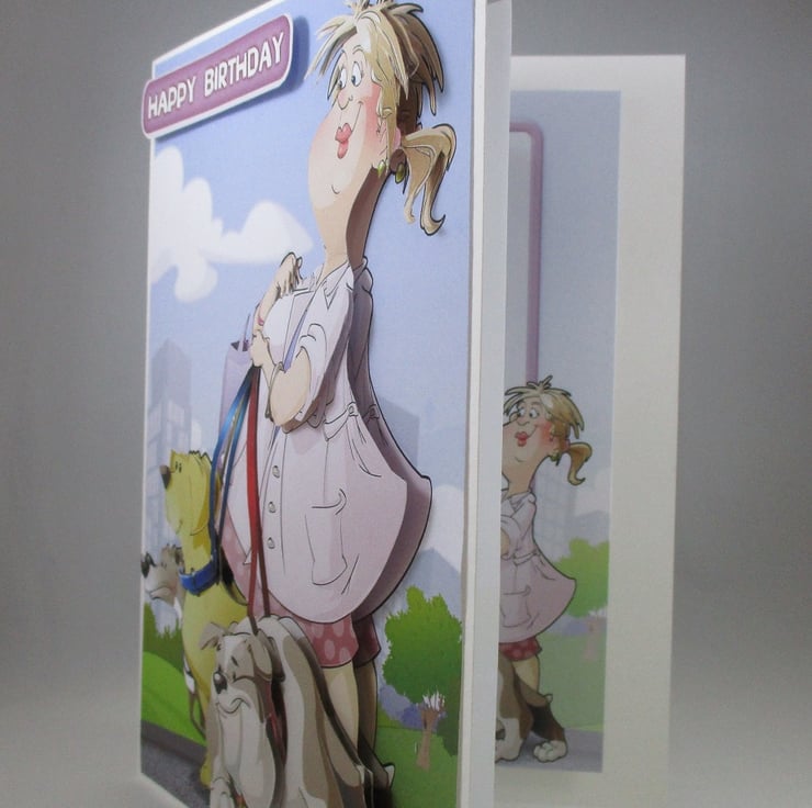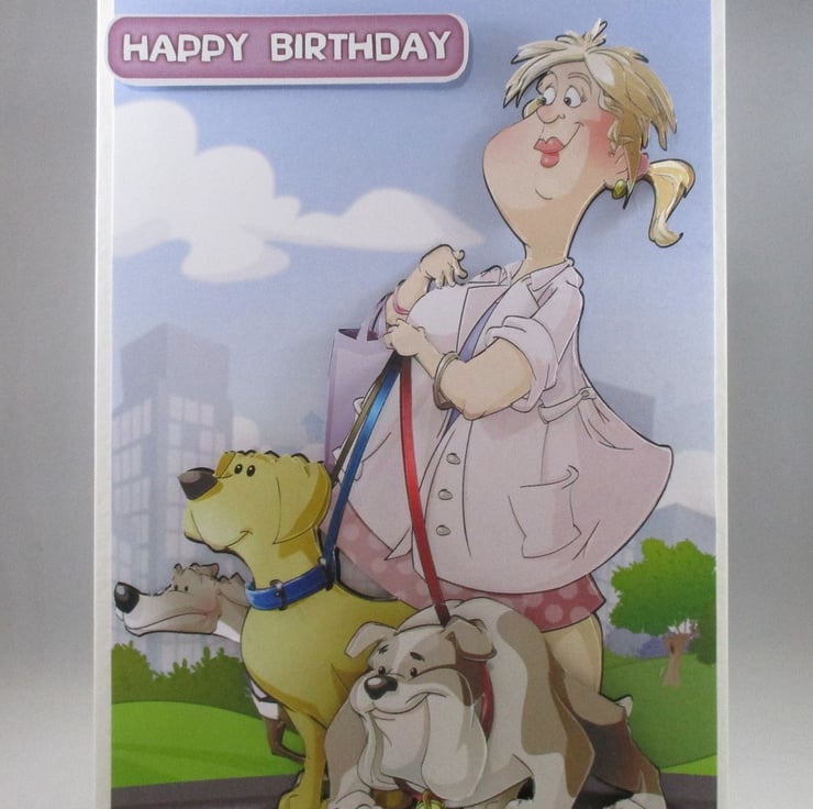 A humorous 3D birthday card measuring approximately 150x205mm (6x8in) features a lady walking her dogs. This card would be ideal for a dog lover and a dog walker.