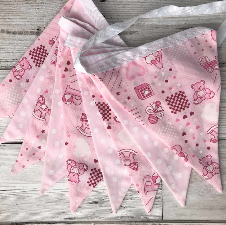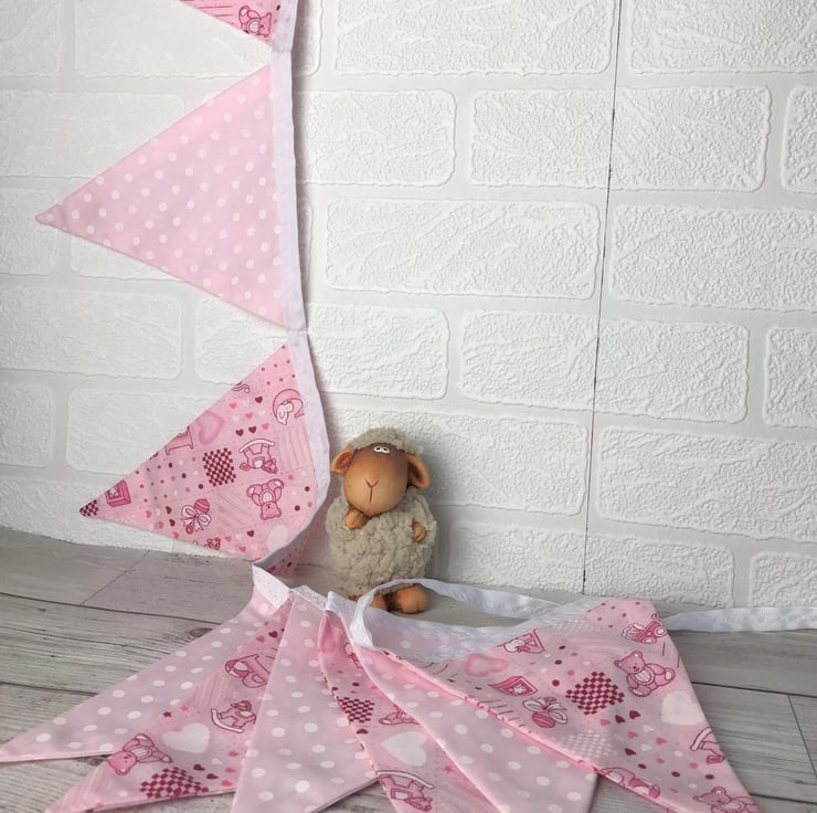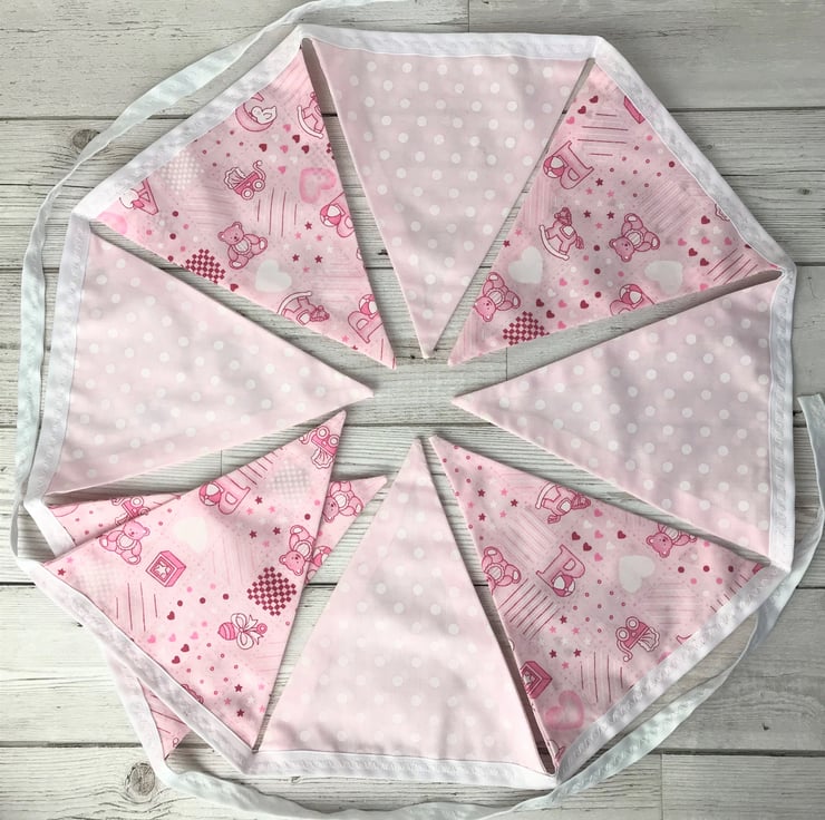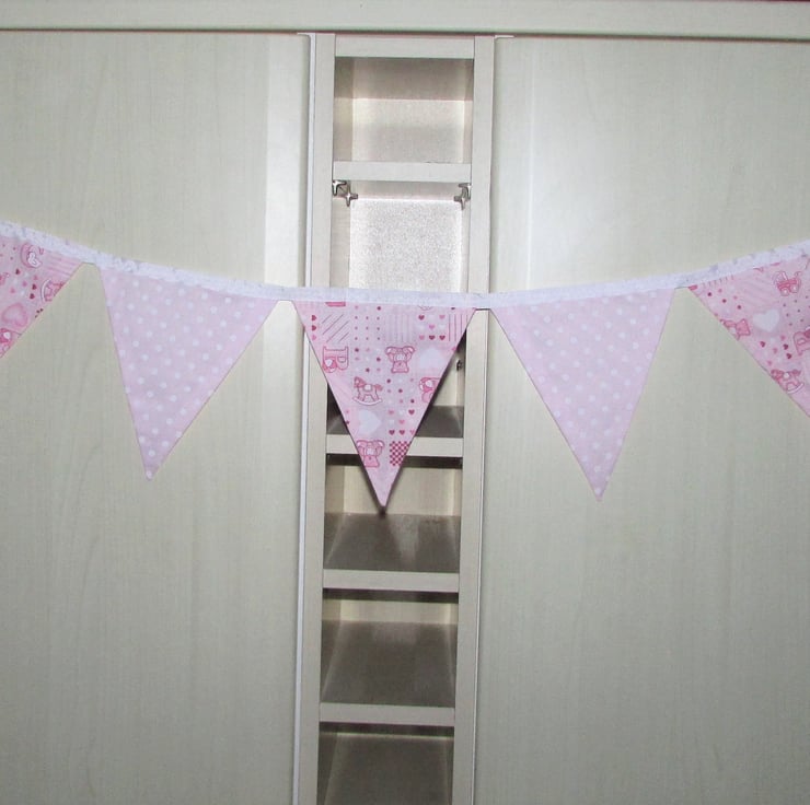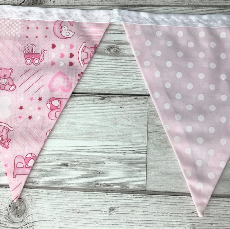Pretty pink bunting to celebrate the birth of a new baby girl. The bunting consists of 9 flags. 5 of the flags are made from a pale pink fabric with a print pattern in darker pink and white featuring teddy bears, prams, rocking horses, rattles, A,B,C and hearts. The other 4 flags are also pale pink with a white polka dot print. The two fabrics compliment each other perfectly. The flags are attached to white grosgrain ribbon and are double-sided with the pattern on the front and back.