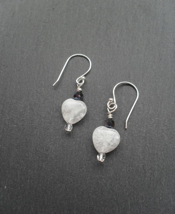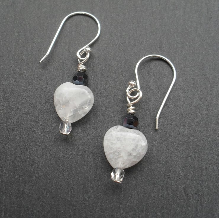 White crackled quartz heart shaped semi precious gemstone beads and Czech glass crystals are attached to silver plated copper ear wires