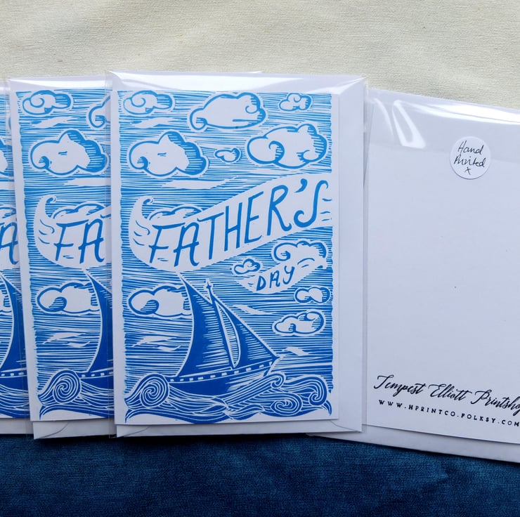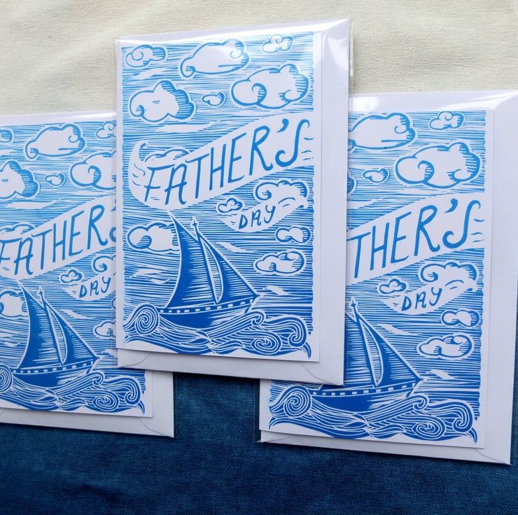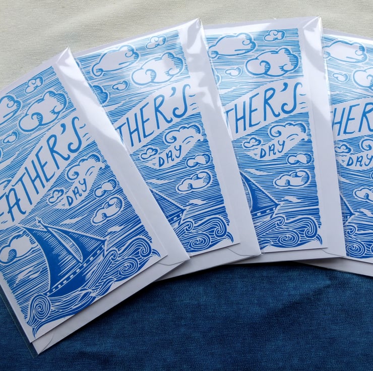 This listing is for a hand printed lino Father's Day card sold singly. Available in a bold, deep blue fading to mid-blue on chalky white card. Comes with envelope and cellophane bag.