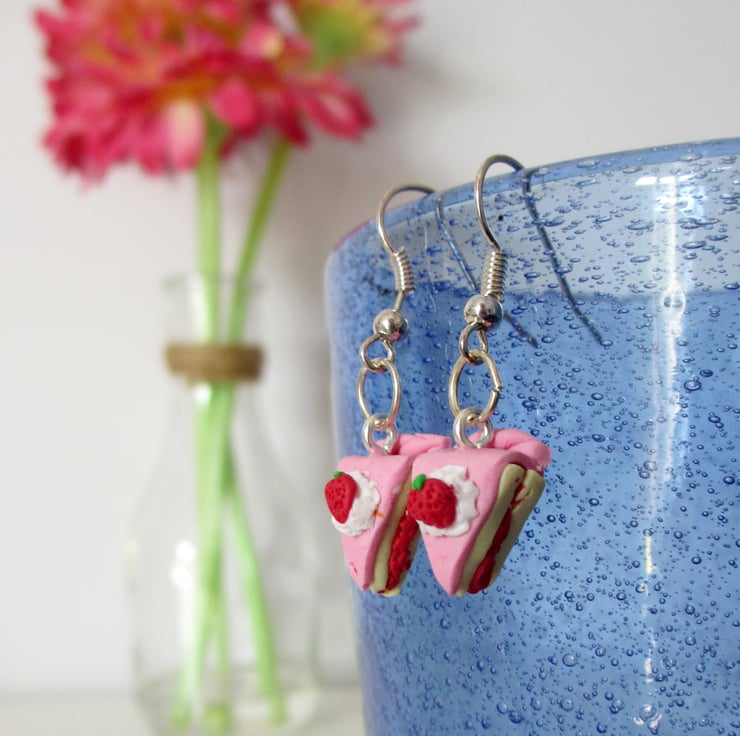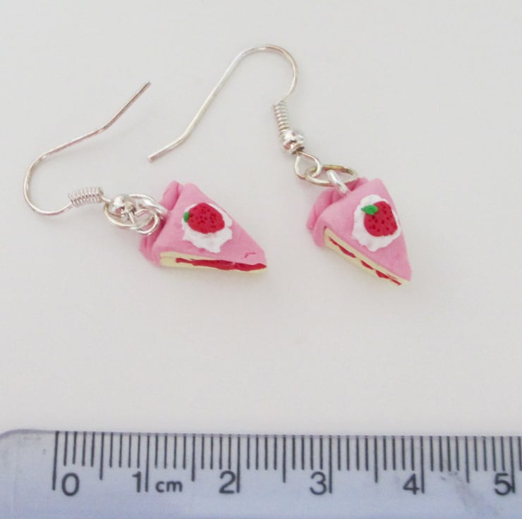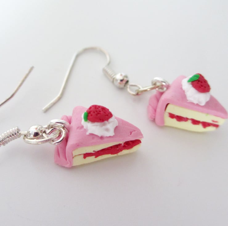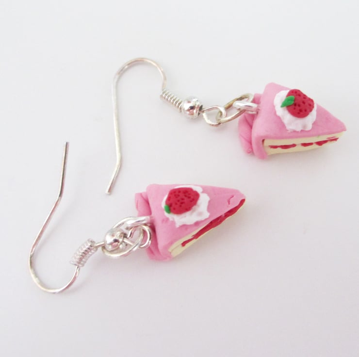 A pair of sweet strawberry cake slice drop earrings, complete with hand crafted cream and strawberry on top! Layers of Attached to fish hook style drop earrings.