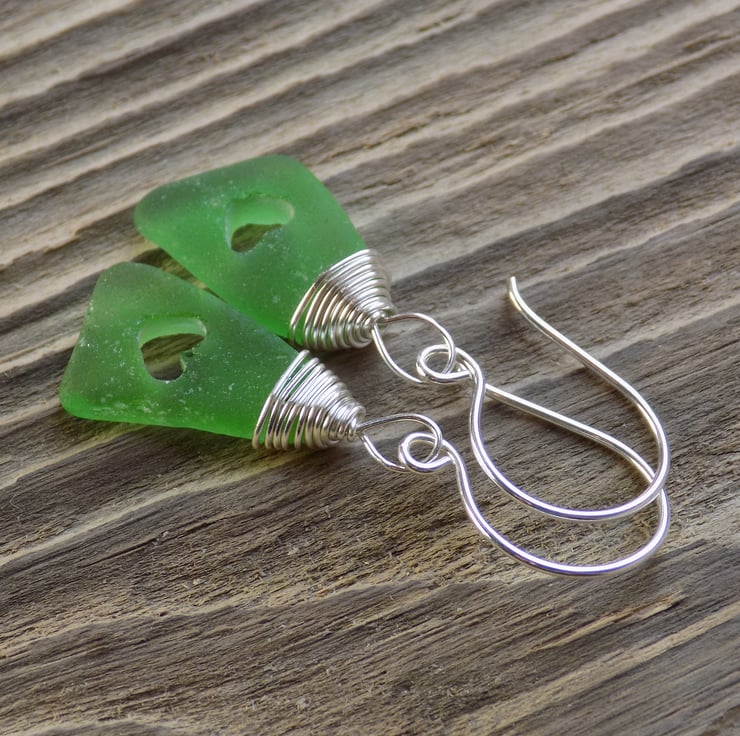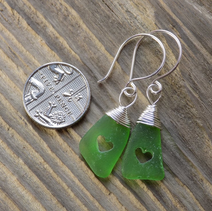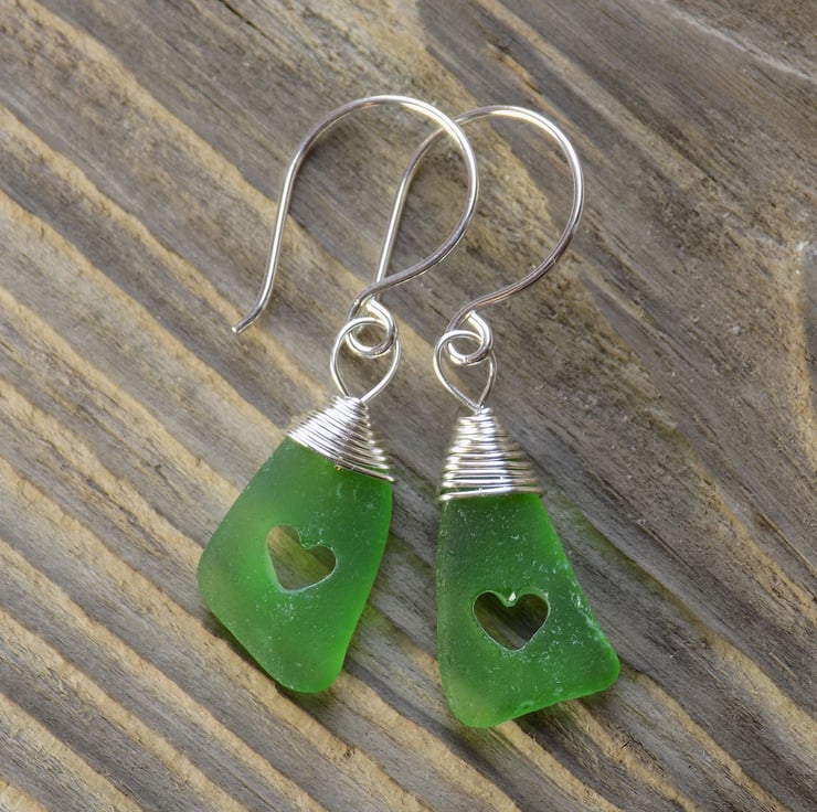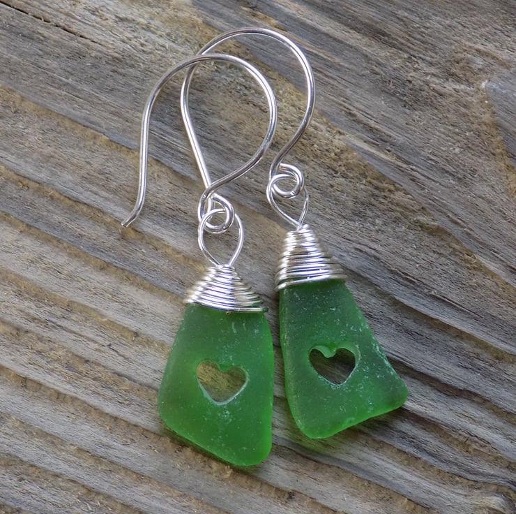 Two pieces of frosted green sea glass, with two dainty hearts drilled within. Wrapped with non-tarnish wire. The earring hooks are handmade from sterling silver 0.8mm wire.