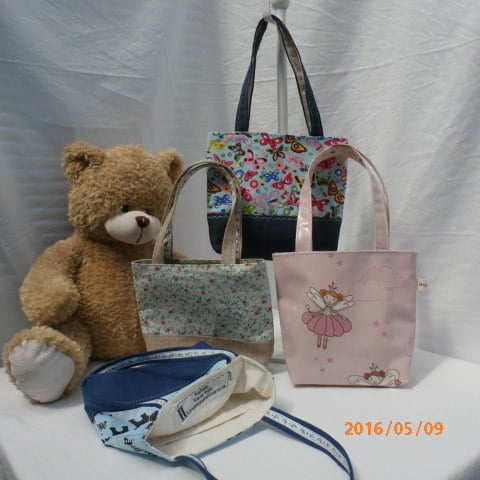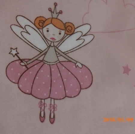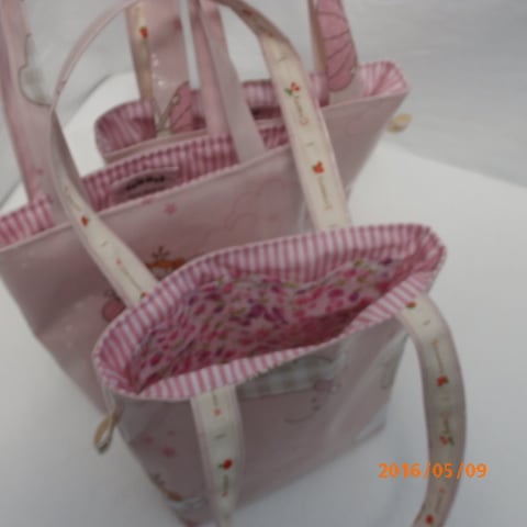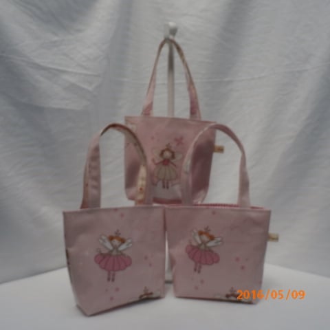 This bag is made from oil cloth with a fairy ballerina with stars and clouds. top stitched side seam has a hand made label stitched in .