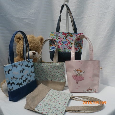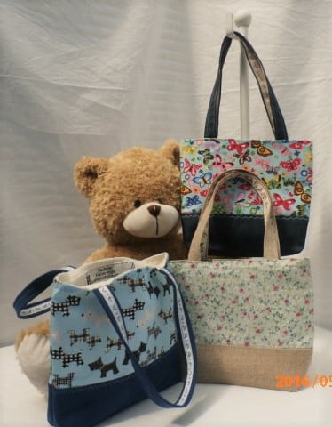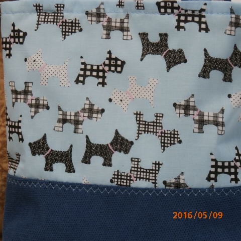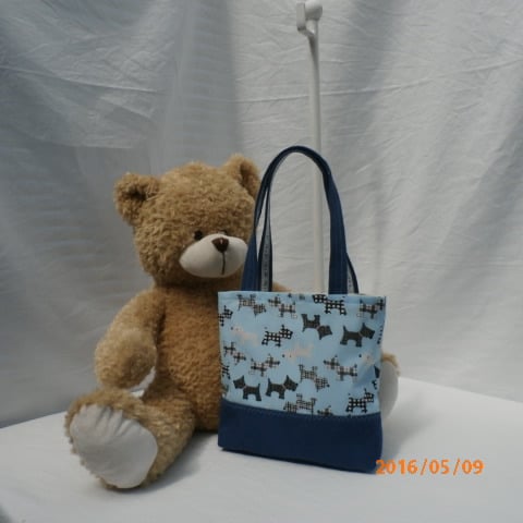 This little girls tote bag is made from a light blue cotton fabric with scottie dogs on it.