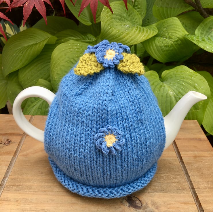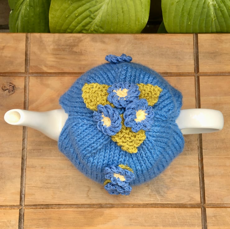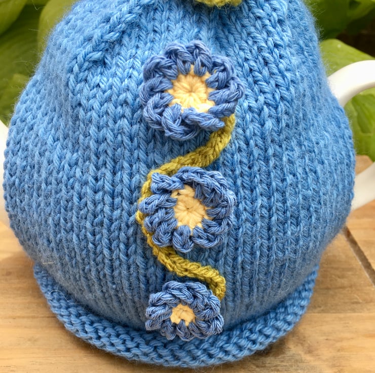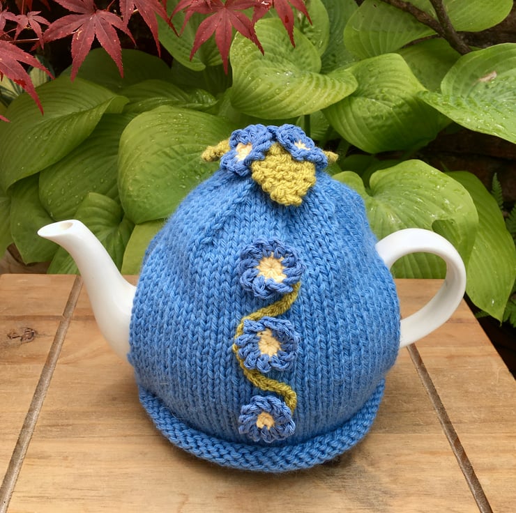 I have created this pretty hand knitted blue tea cosy with good quality wool/acrylic mix yarn. Crocheted cotton forget-me-not flowers are attached with knitted green leaves and stems. It would make a pretty addition to any breakfast or tea table.