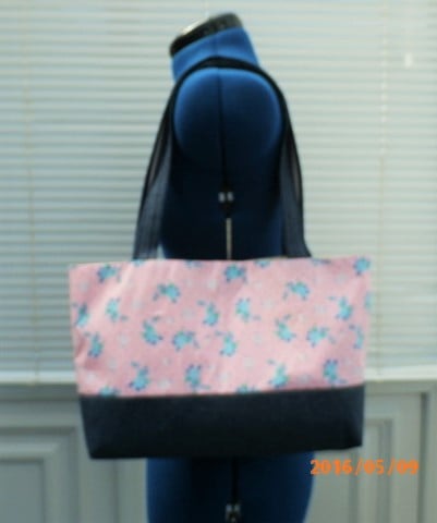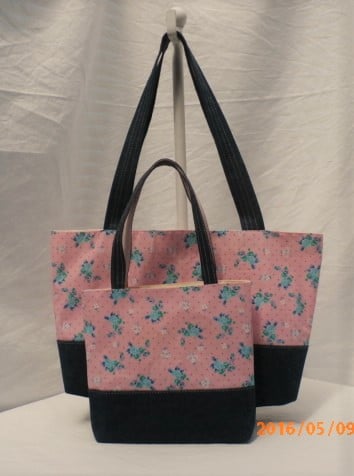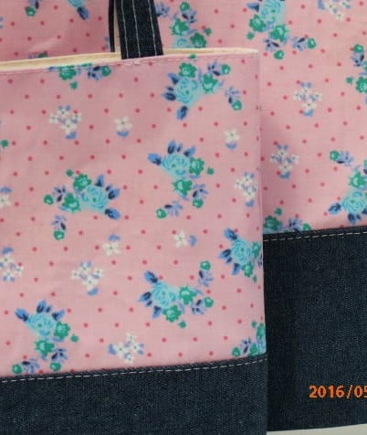 This listing is for two tote bags mummies tote bag and little girl's matching tote bag .Both bags are made from a light pink cotton fabric with a small dark pink dot on the back ground the print is of roses in a sky blue with small white flowers . I have interfaced both bags to give it body.