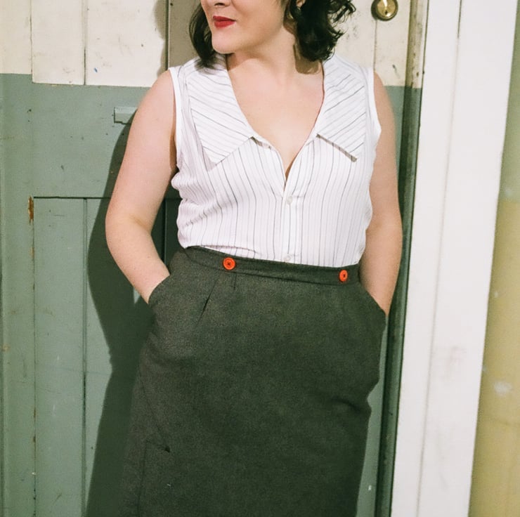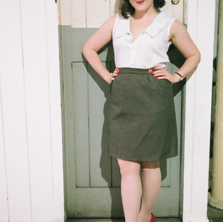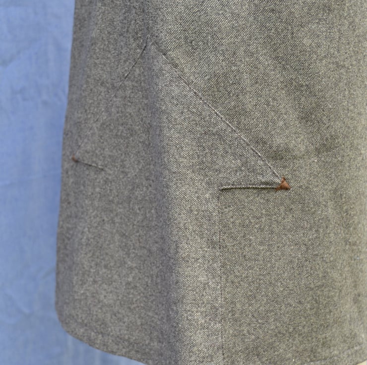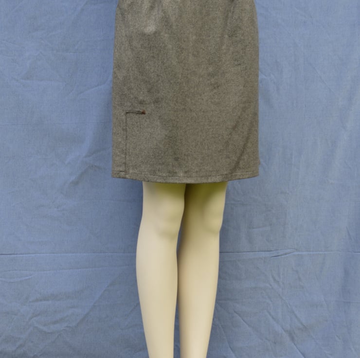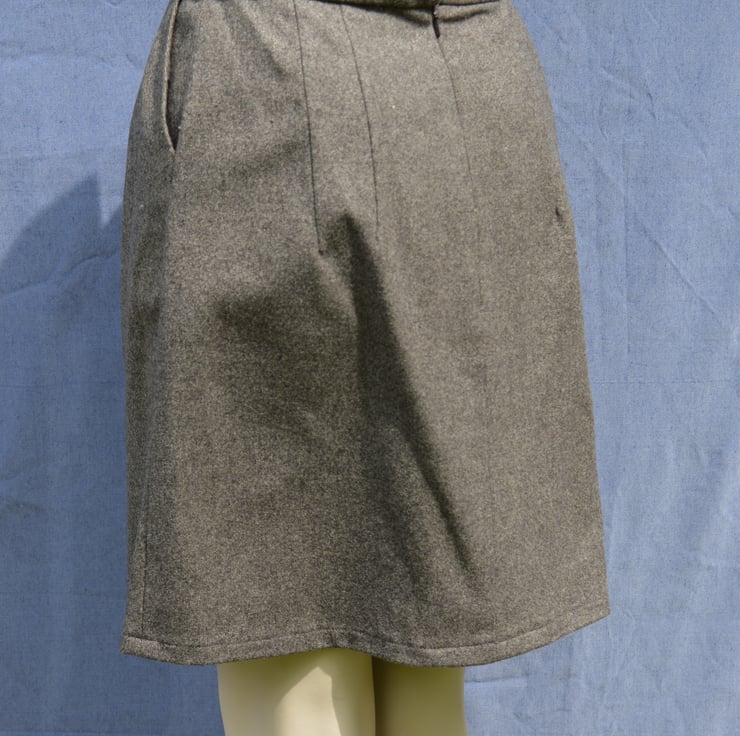 This item is made from a vintage skirt, re-cut to a new size and fit, whilst making use of the original pockets. Not having the quite enough fabric for the skirt prompted the use of the arrow design which was inspired by a 1940s design.