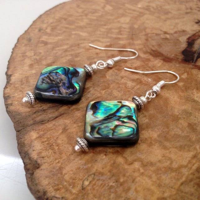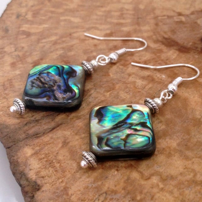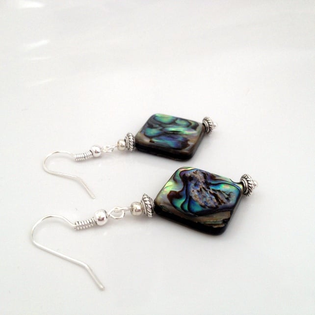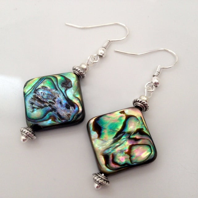 These pretty earrings feature beautiful Abalone in 15mm squares that are double sided so you get the effect of the Abalone on both sides of the square.