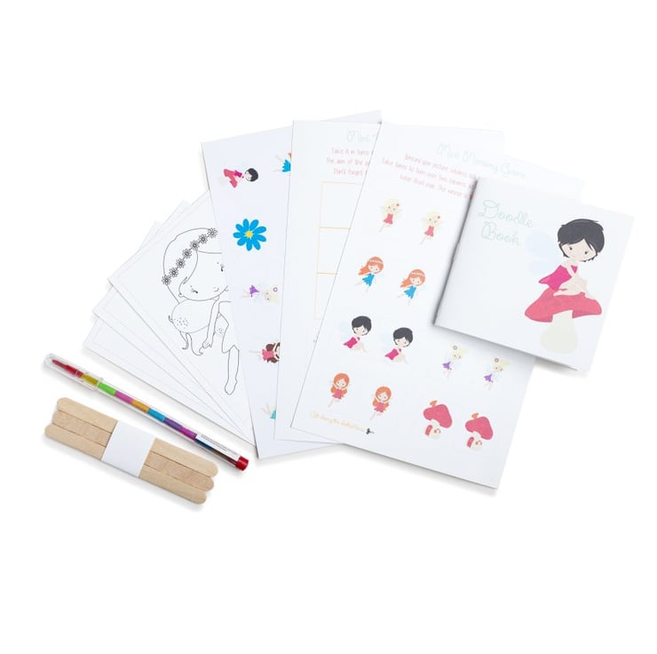 a mini doodle book, a rainbow swap crayon pencil a colour in stick puppet kit, sticker sheet, memory game card and a 'Tic-Tac-Toe' (noughts & crosses) game card.