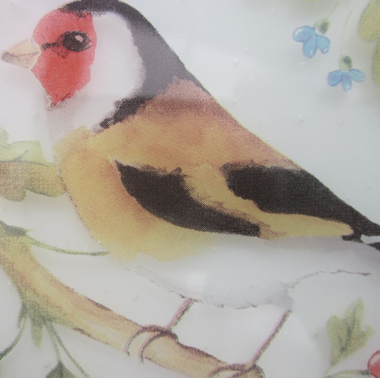 This coaster has a beautiful goldfinch design on white glass. It has been fully annealed to make it strong and is suitable for use with hot tea or coffee cups but not pans straight from the oven. It would make a great gift, secret santa or stocking filler.
