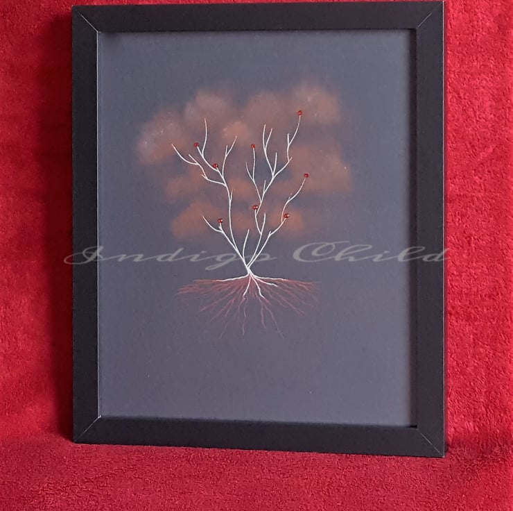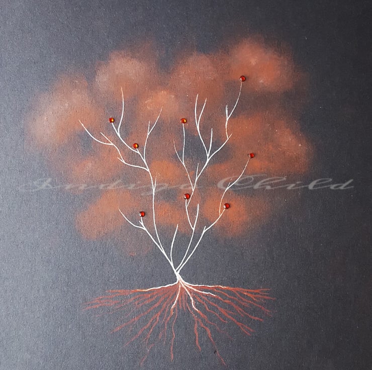 I have used a white Sigma UniBall pen to draw the tree, then I used red/orange and white soft pastels for the top of the tree and a Derwent colouring pencil in Deep Vermillion for the roots. I used 12 x 10 inch black card to draw on.