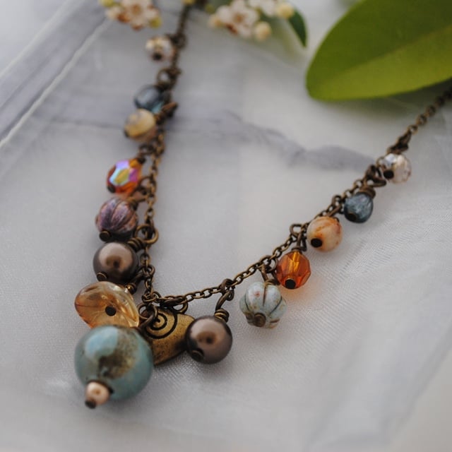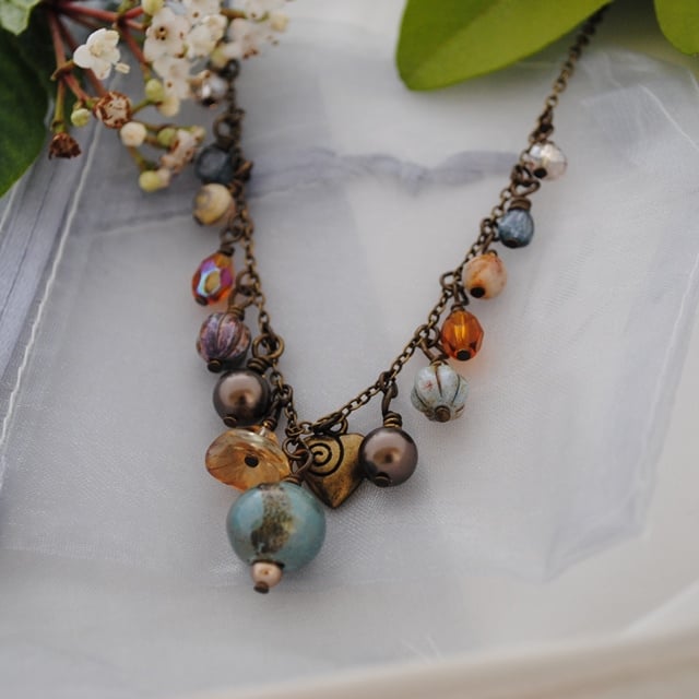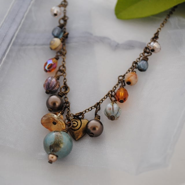 This lovely charm necklace is made with a variety of bead charms which hang in a soft V shape from an antique brass chain necklace. The charms include an antique brass heart, a large jonquil flower bead and swarovski pearls. The colour mix includes capri blue, olive and dark blue. The necklace also has picasso melon beads, champagne crystals and crazy lace agate beads.