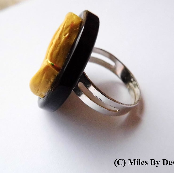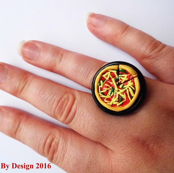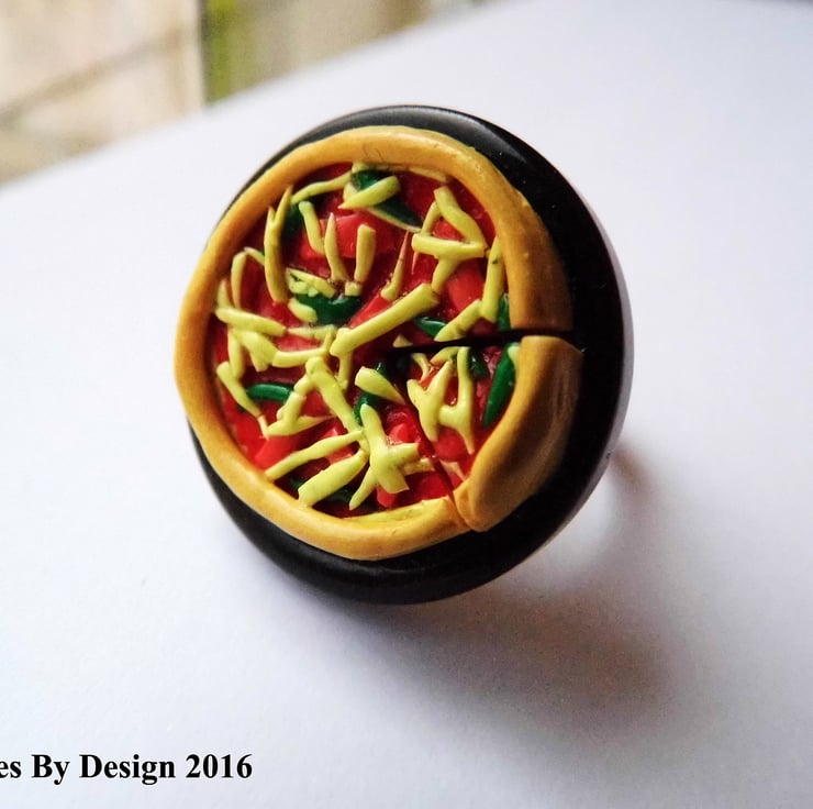 The pizza was then affixed to a plastic button tray that is securely attached to the adjustable ring back, perfect if you change what finger you wear your rings on.