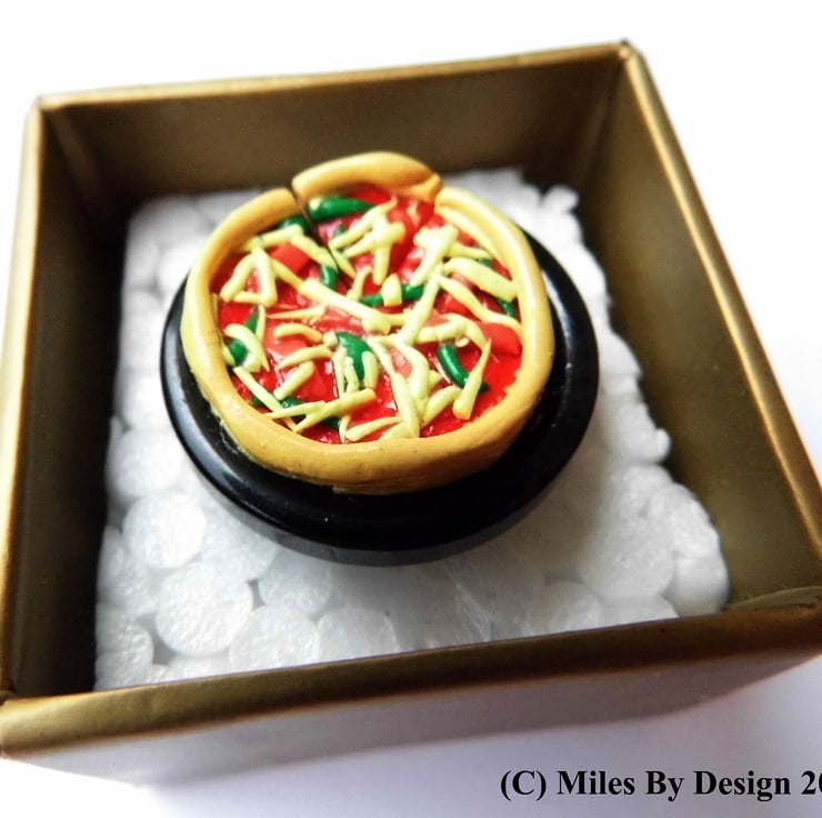 The pizza itself, with its lashings of tomato puree, grated cheese, pieces of ham and green pepper pieces, has been crafted from polymer clay.