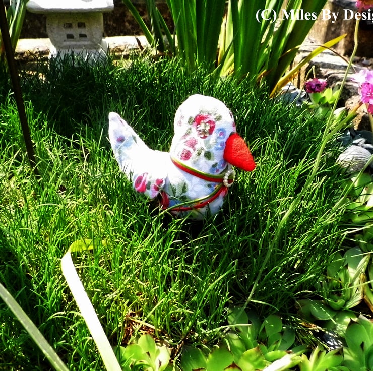 The neck embellishment is made from red & green faux suede strips with a pearl coloured plastic buckle. Her eyes are made from beads securely sewn in place. The body & wings are firmly stuffed with hollow fibre filling.