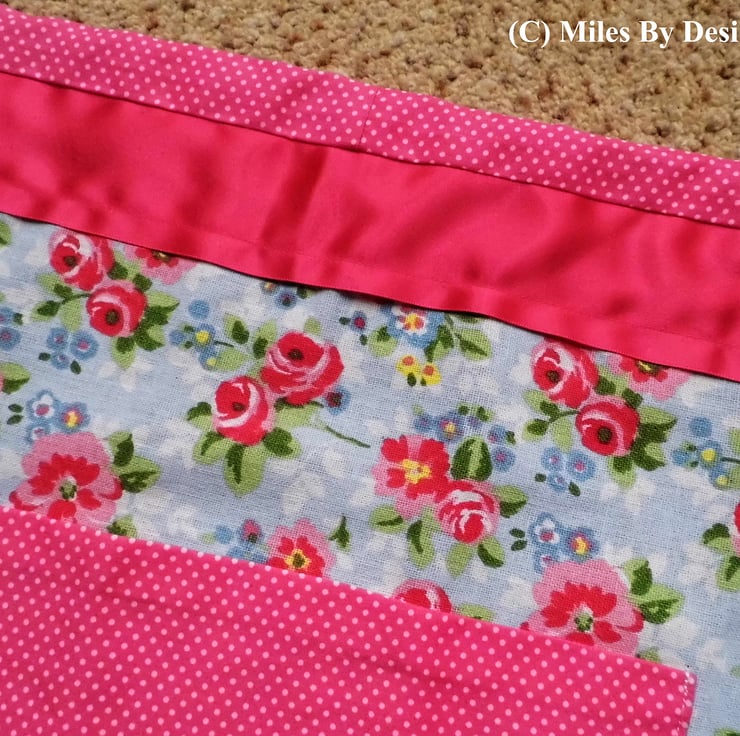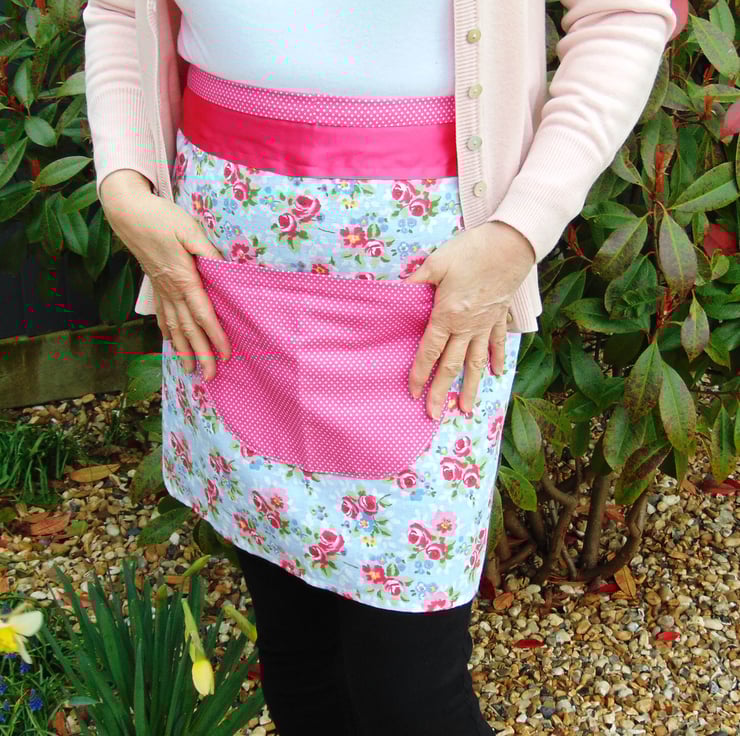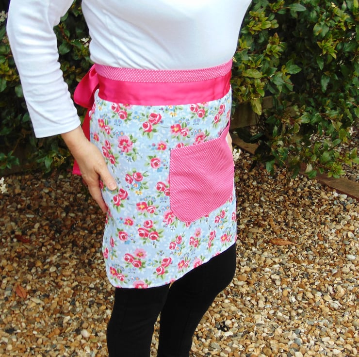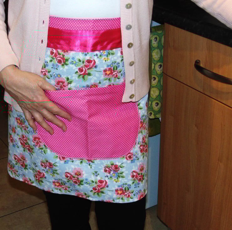 The apron is made from a floral cotton fabric with a blue background colour, with a bright pink and white polka dot cotton pocket.